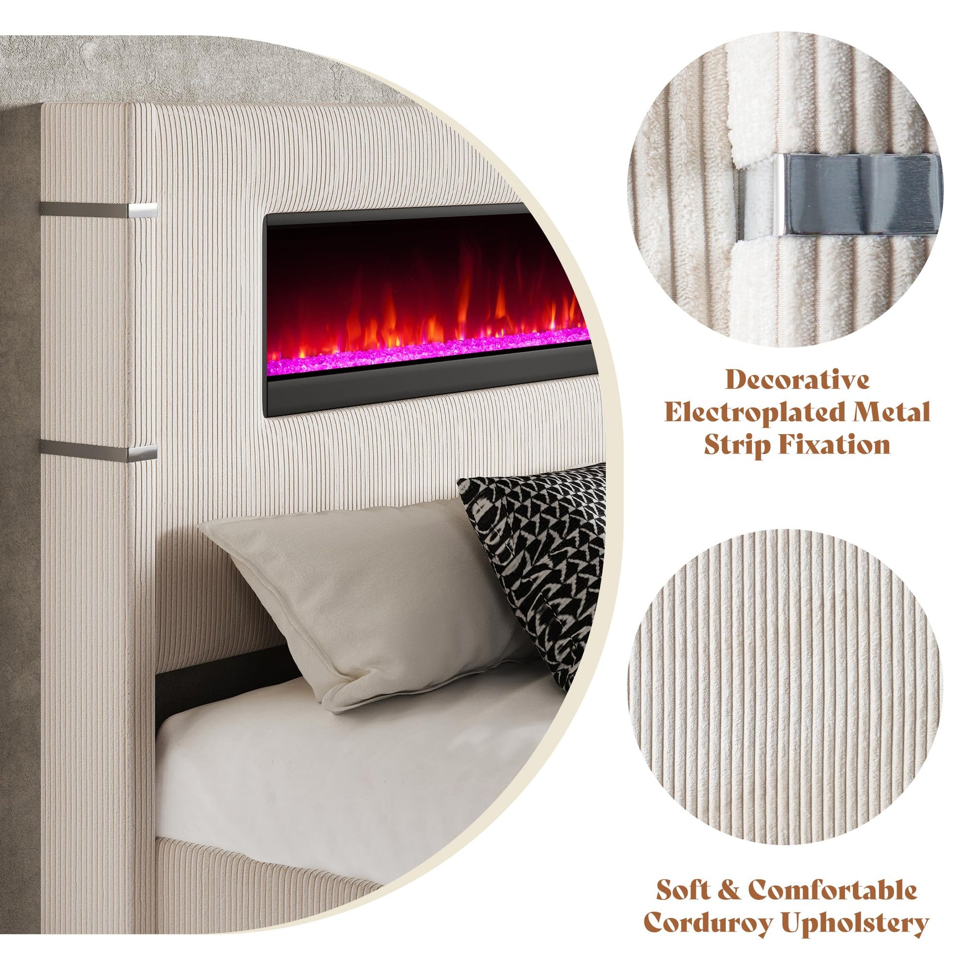 AMERLIFE Modern California King Size Bed Frame with Fireplace, Wingback Platform Bed Frame with 60.4“ Extra Tall Headboard, Corduroy Upholstered Bed Frame Wooden Slats/No Box Spring Needed, Beige