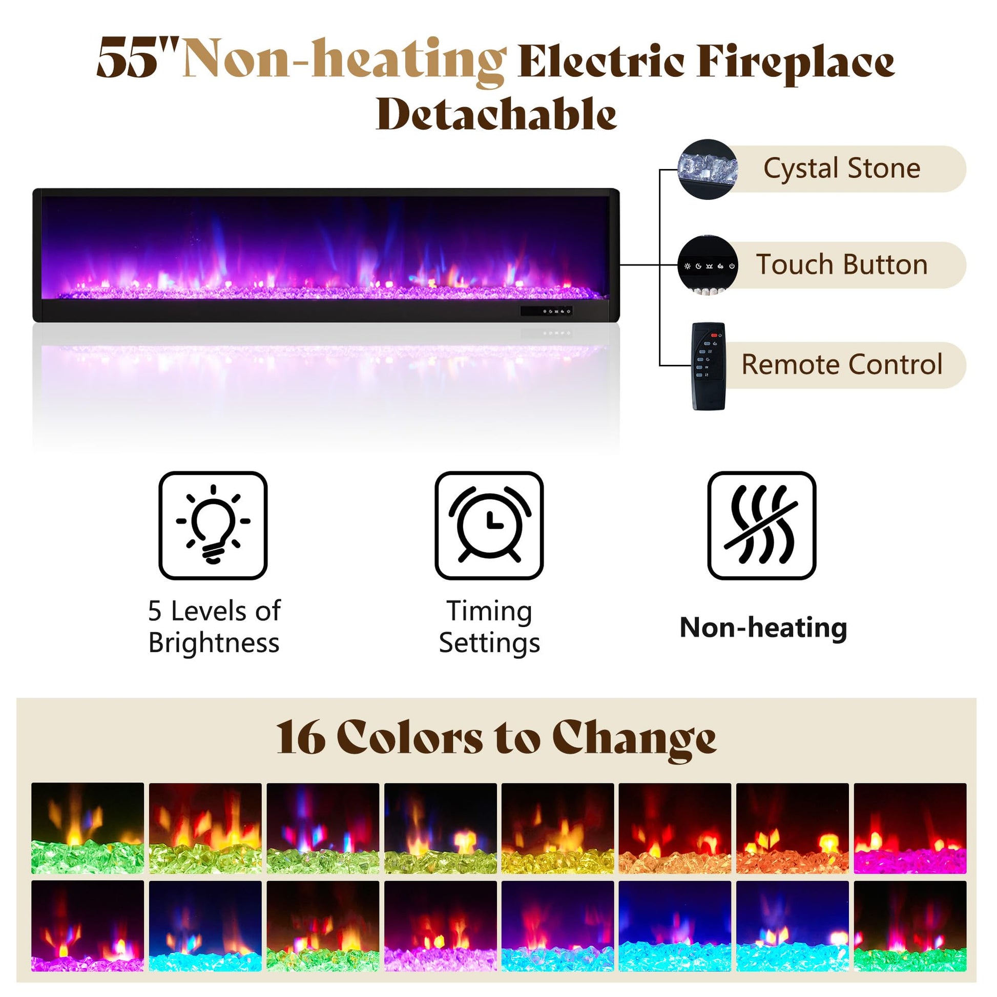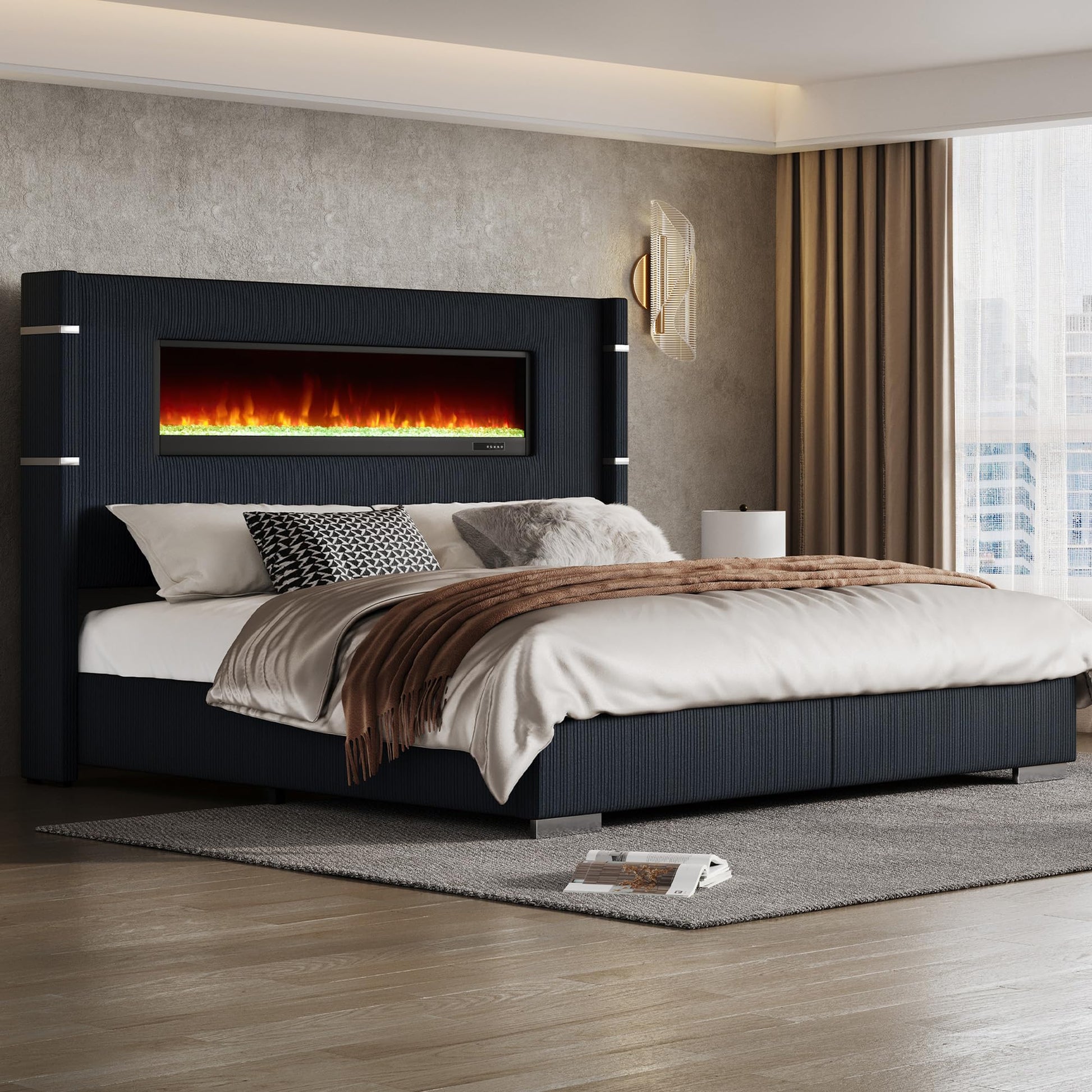 - Fireplace Bed Frame: 55“ Non-heating electric fireplace features 16-color flame and crystals with five levels of adjustable brightness. Comes with a handy remote control for convenience