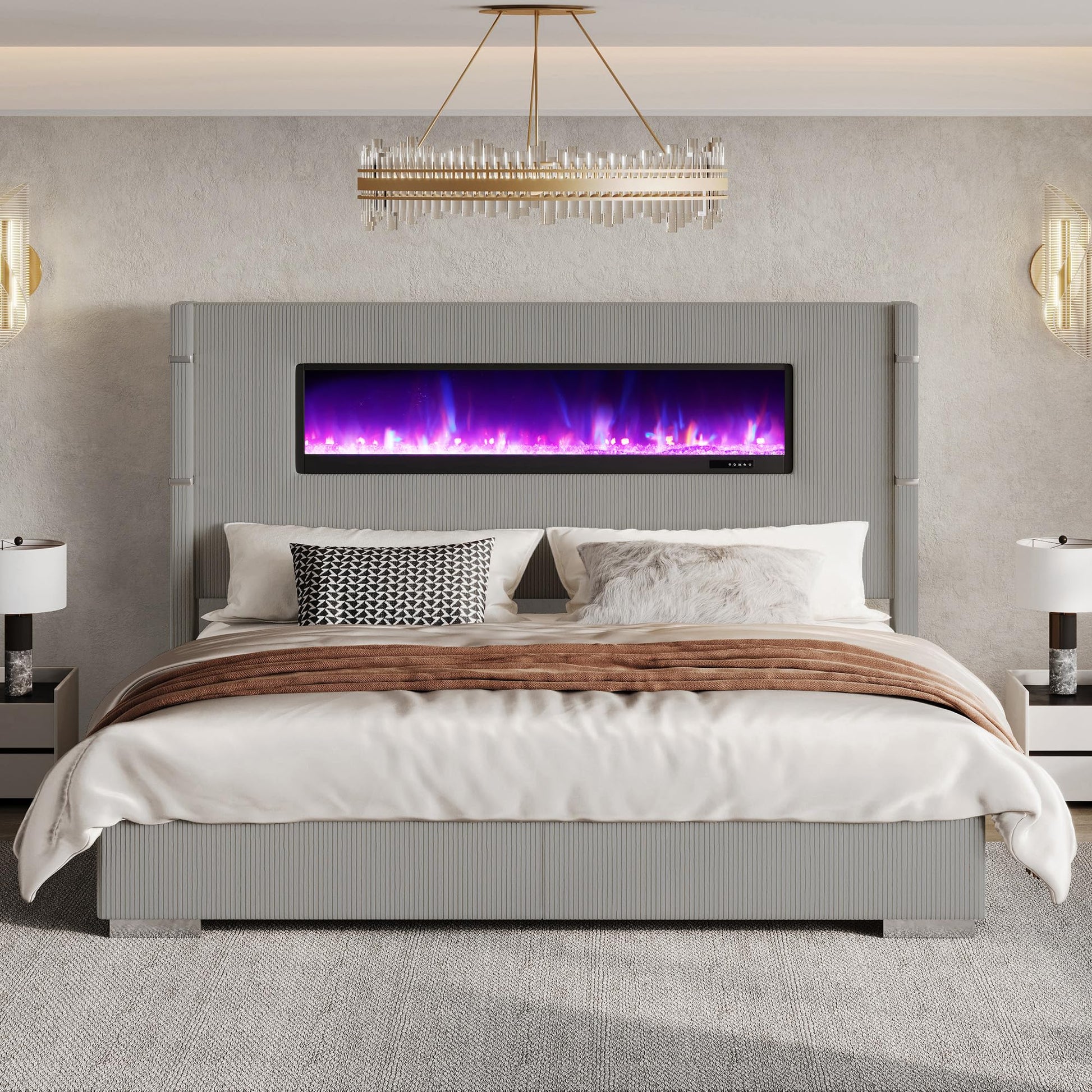 AMERLIFE Modern California King Size Bed Frame with Fireplace, Wingback Platform Bed Frame with 60.4“ Extra Tall Headboard, Corduroy Upholstered Bed Frame Wooden Slats/No Box Spring Needed, Greige