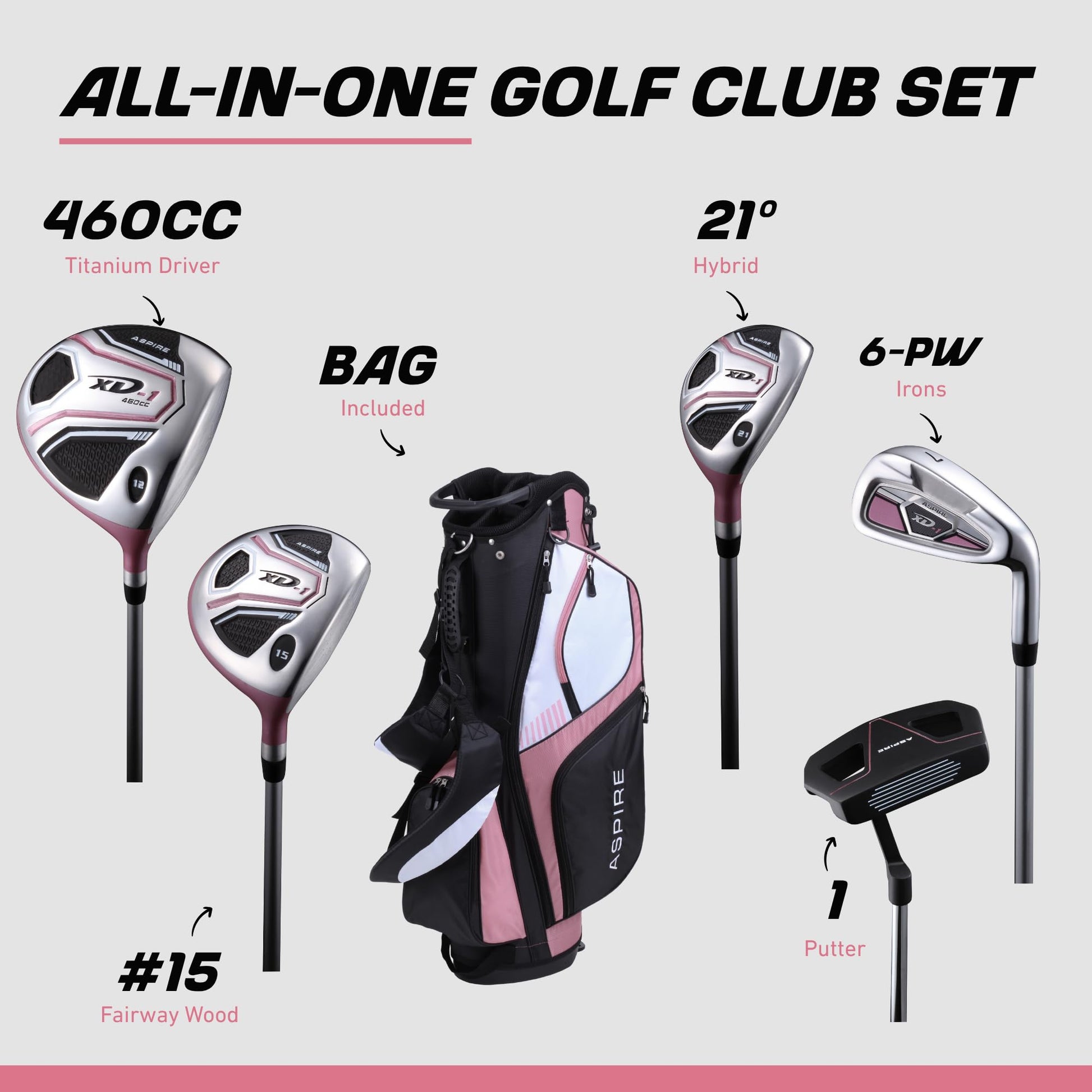Aspire XD1 Womens Golf Clubs Full Set, Includes Driver, Fairway, Hybrid, 6-PW Irons, Putter, Stand Bag, 3 H/C's, Ultra-Light Graphite Shafts, Golf Clubs Women Right Handed, Comes in 3 Sizes, Pink