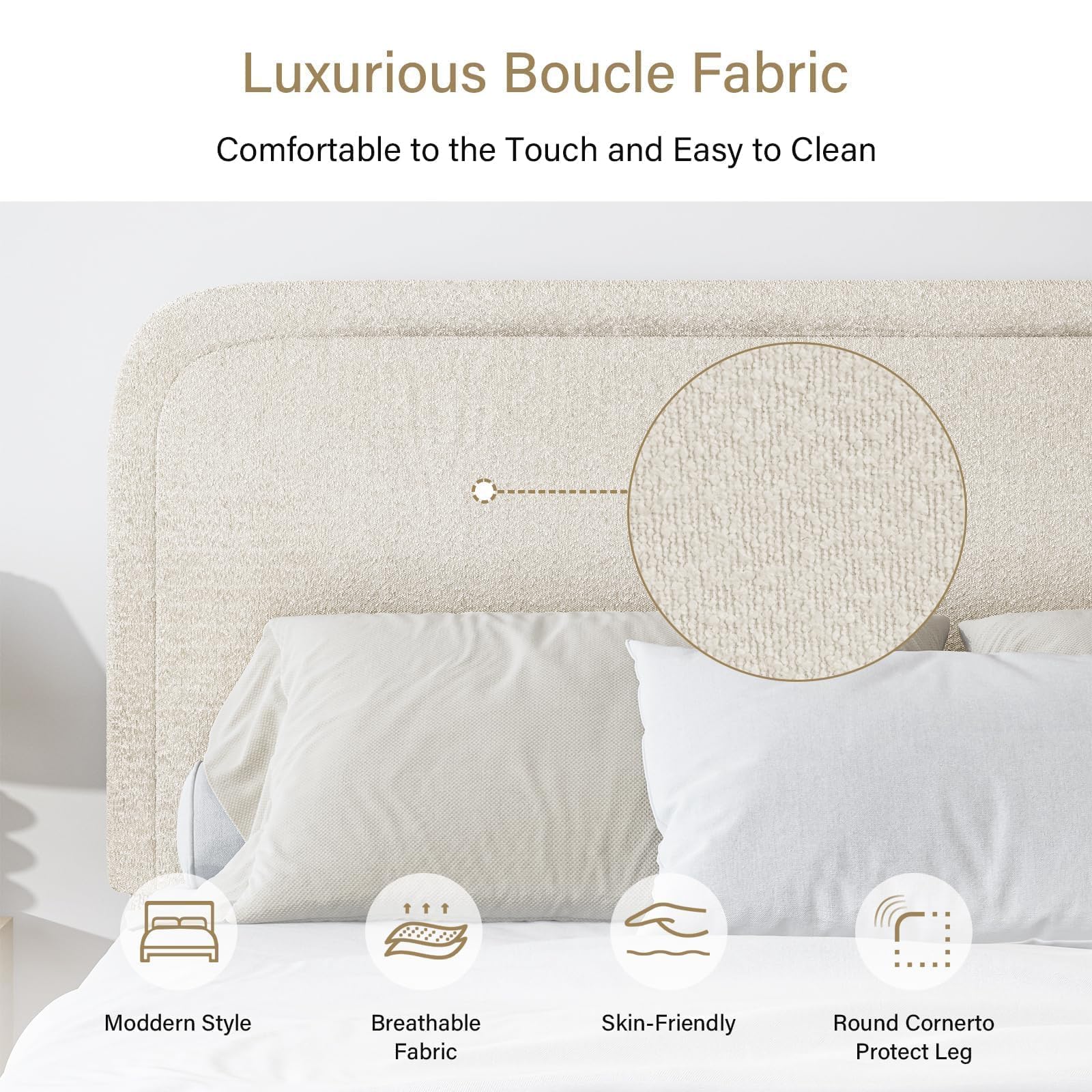 BarnFurin Boucle Upholstered California King Bed Frame/Soft Rounded Corners Headboard/Low Profile Bed Frame/No Box Spring Needed/Cream
