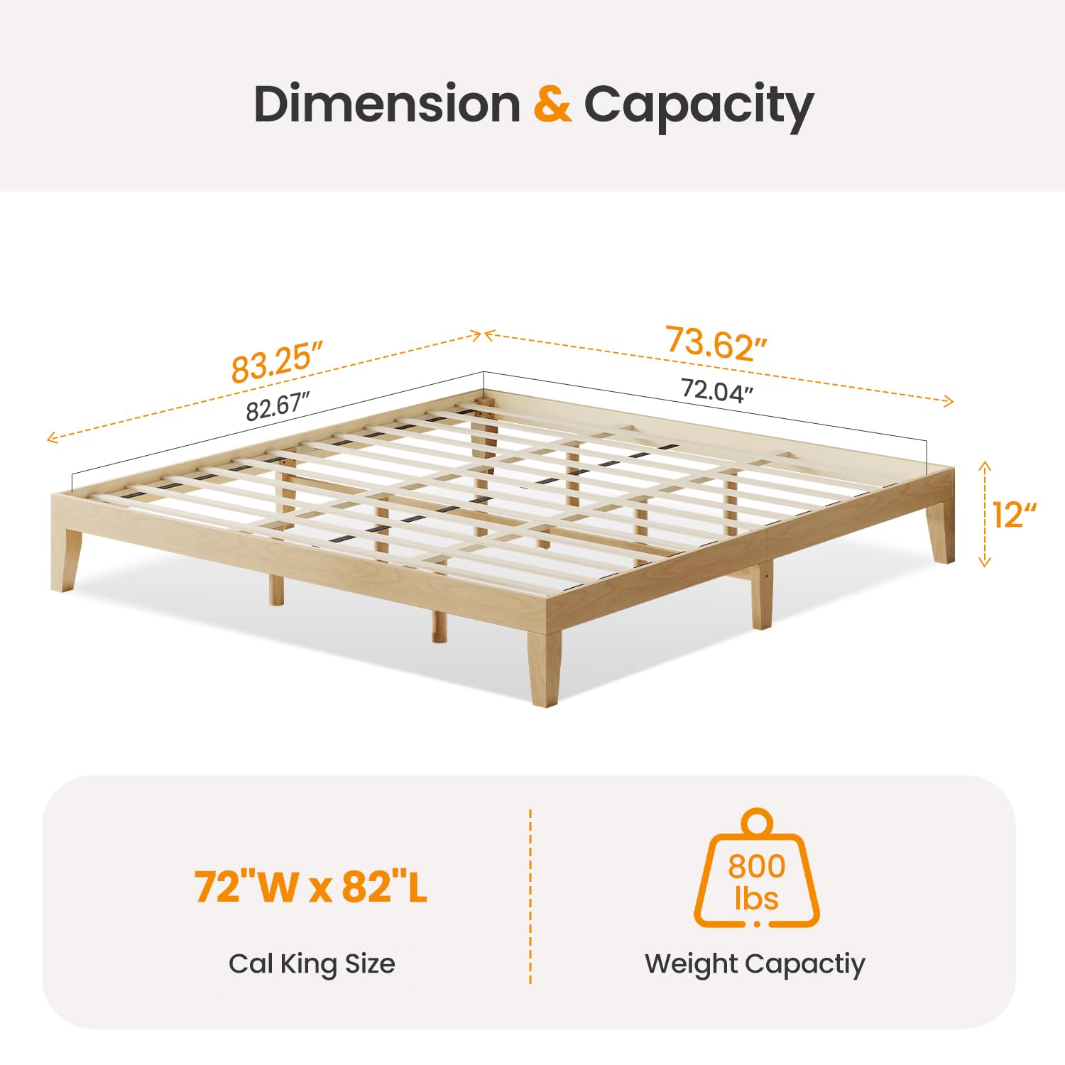Cal King Size Wood Platform Bed Frame, 12 Inch Solid Wood Bed Frame with Wooden Slats, No Box Spring Needed, Easy Assembly, Rustic Pine