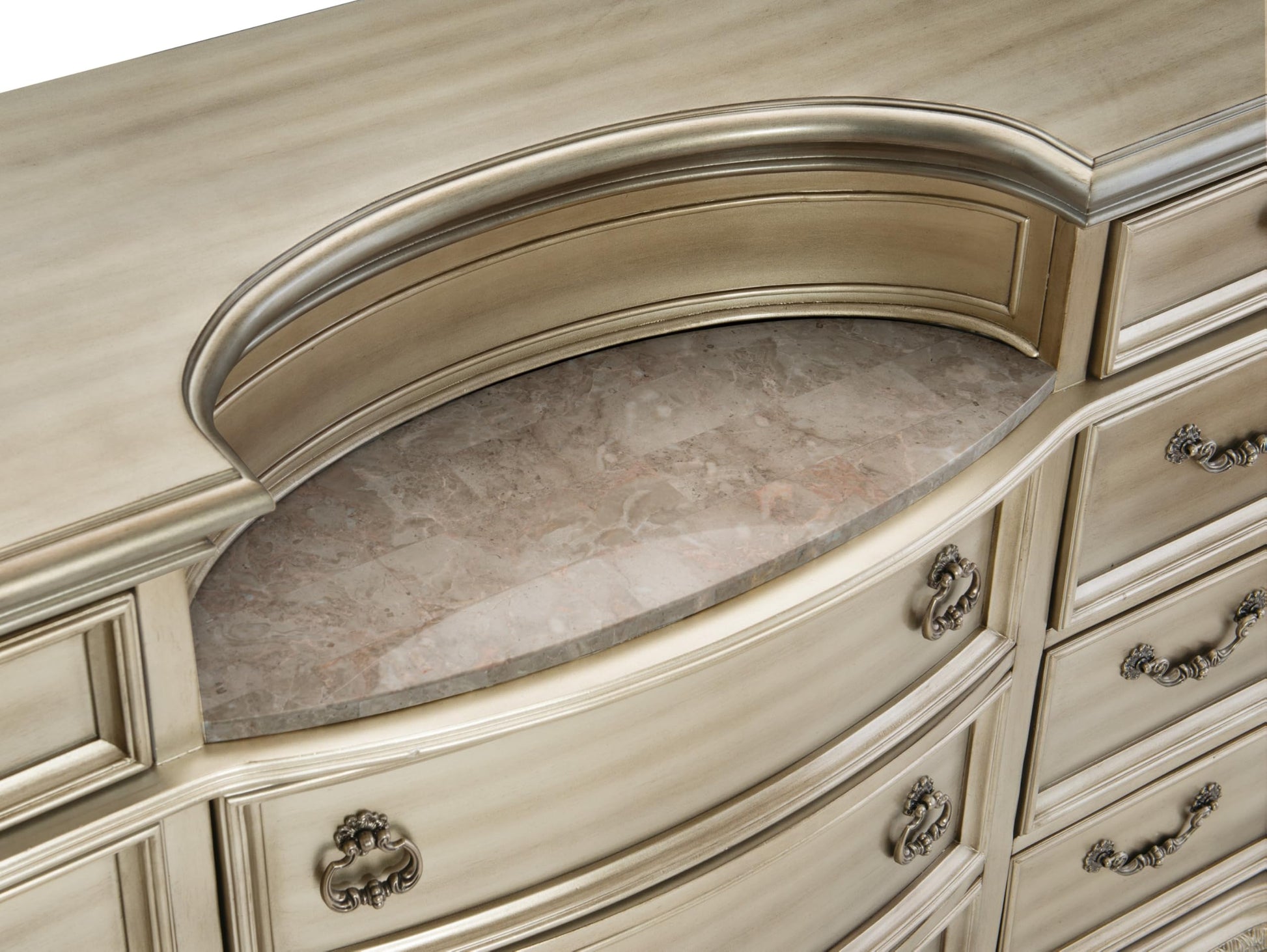 Classic Traditional Bedroom 4pc Set California King Size Upholstered Bed Silver Finish Marble Top Formal Wooden Furniture