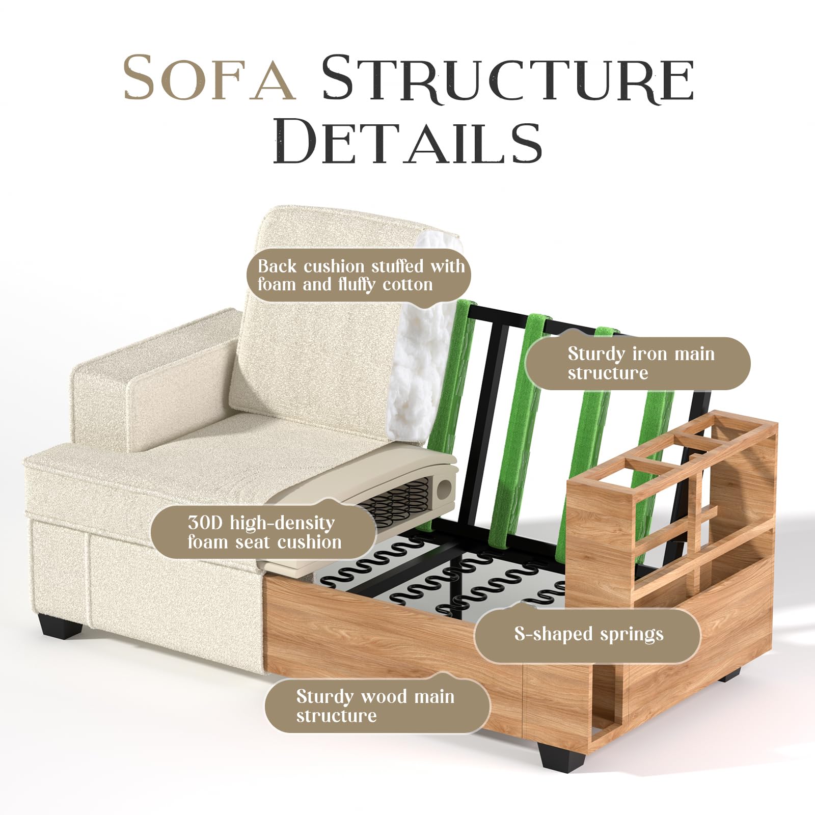 - 【Extra Sturdy & High-Quality】 : Our sectional couch boasts a robust, durable wood frame and high-quality springs, supporting up to 900 lbs. Notably, our three-seat sofa is built with a reinforced iron main frame, enhancing its support, stability and longevity. The solid wood legs come with protective pads to safeguard your floor or carpet from the wear and tear. Relax with confidence and immerse into the superior comfort of our durable sofa bed.