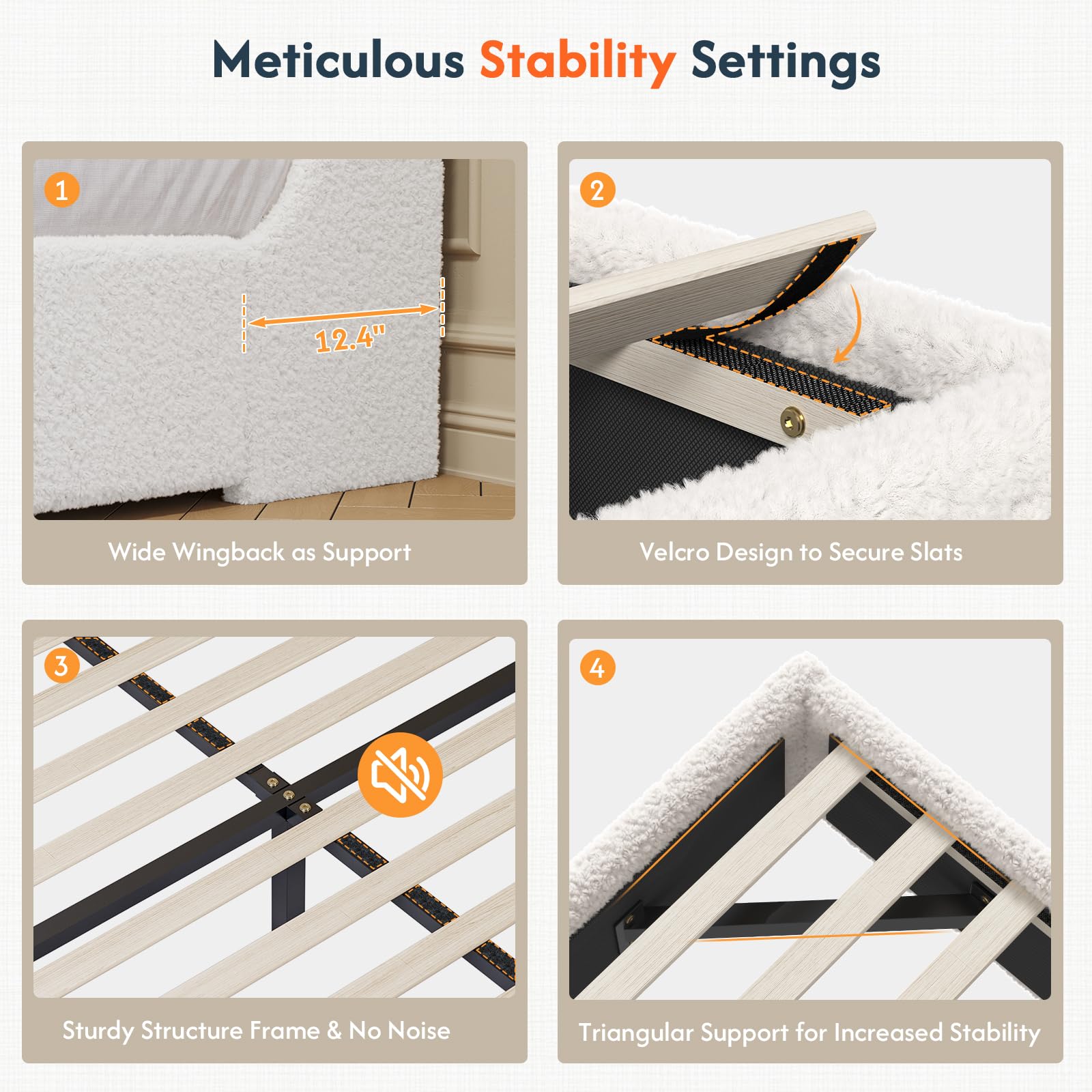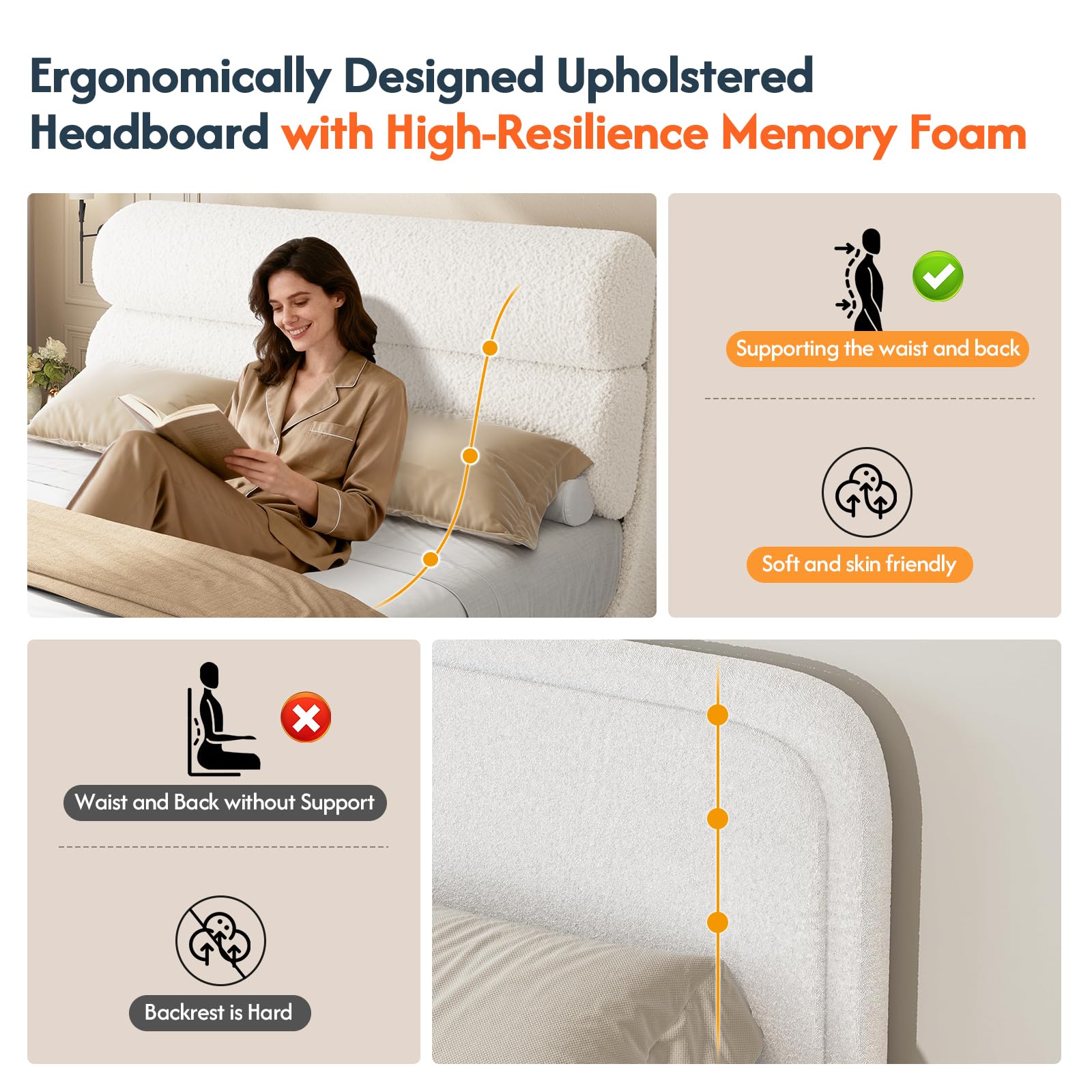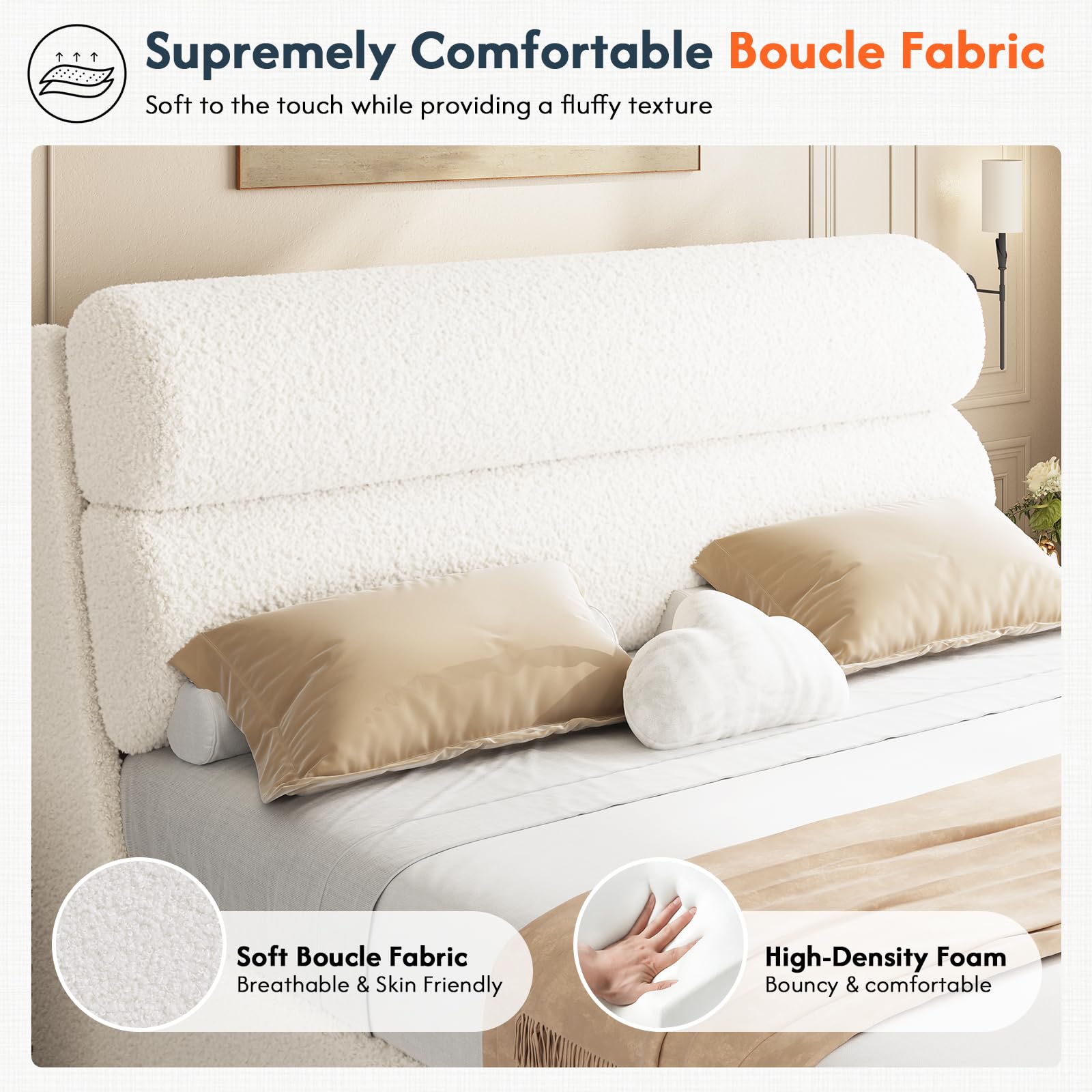 - 【Designed for Comfort & Safety】The soft bed frame is entirely wrapped in boucle fabric, which adds a touch of gentleness to the bedroom and reduces the risk of daily collisions, and keeps you and your loved ones safe.The perfect choice for families with kids, teens, and adults.