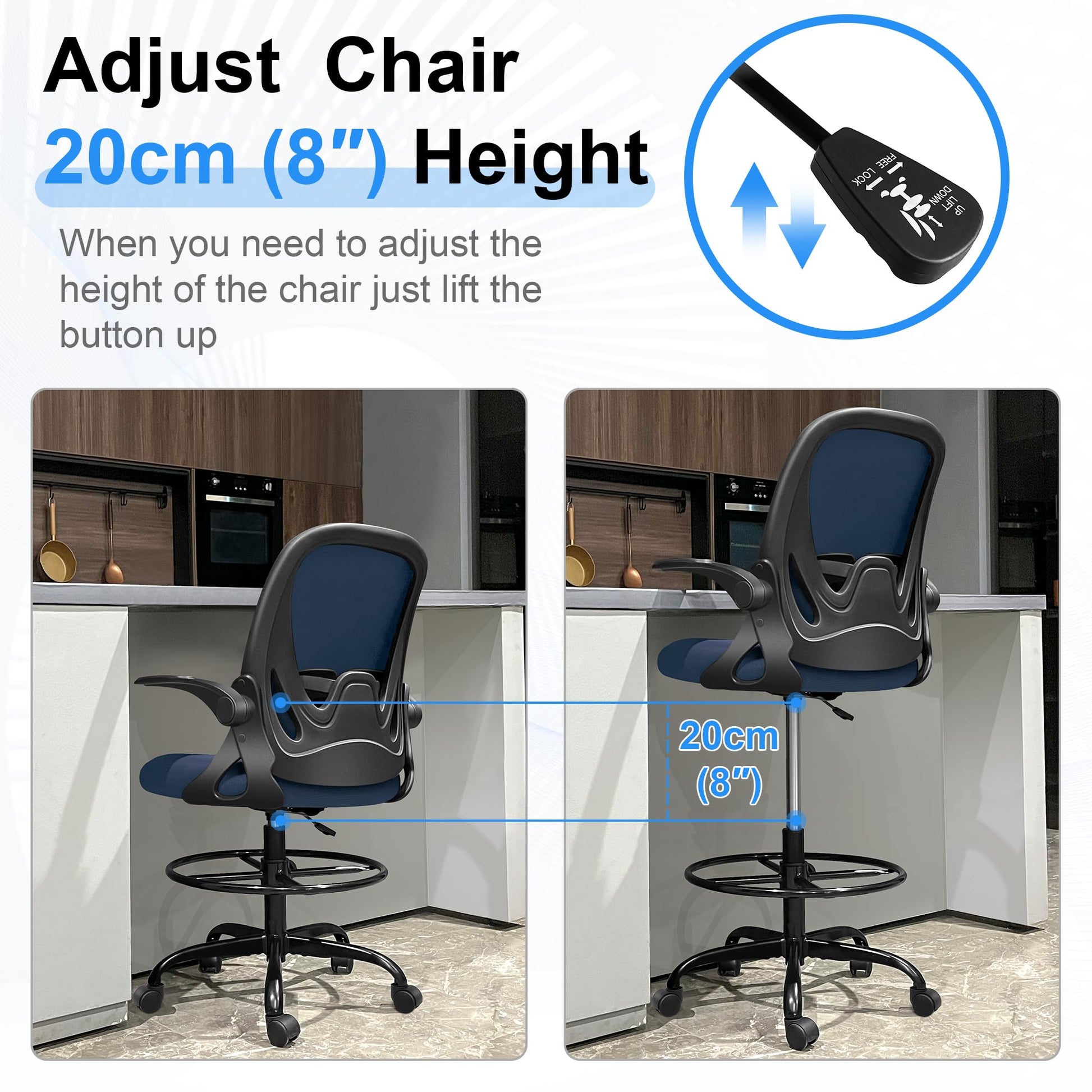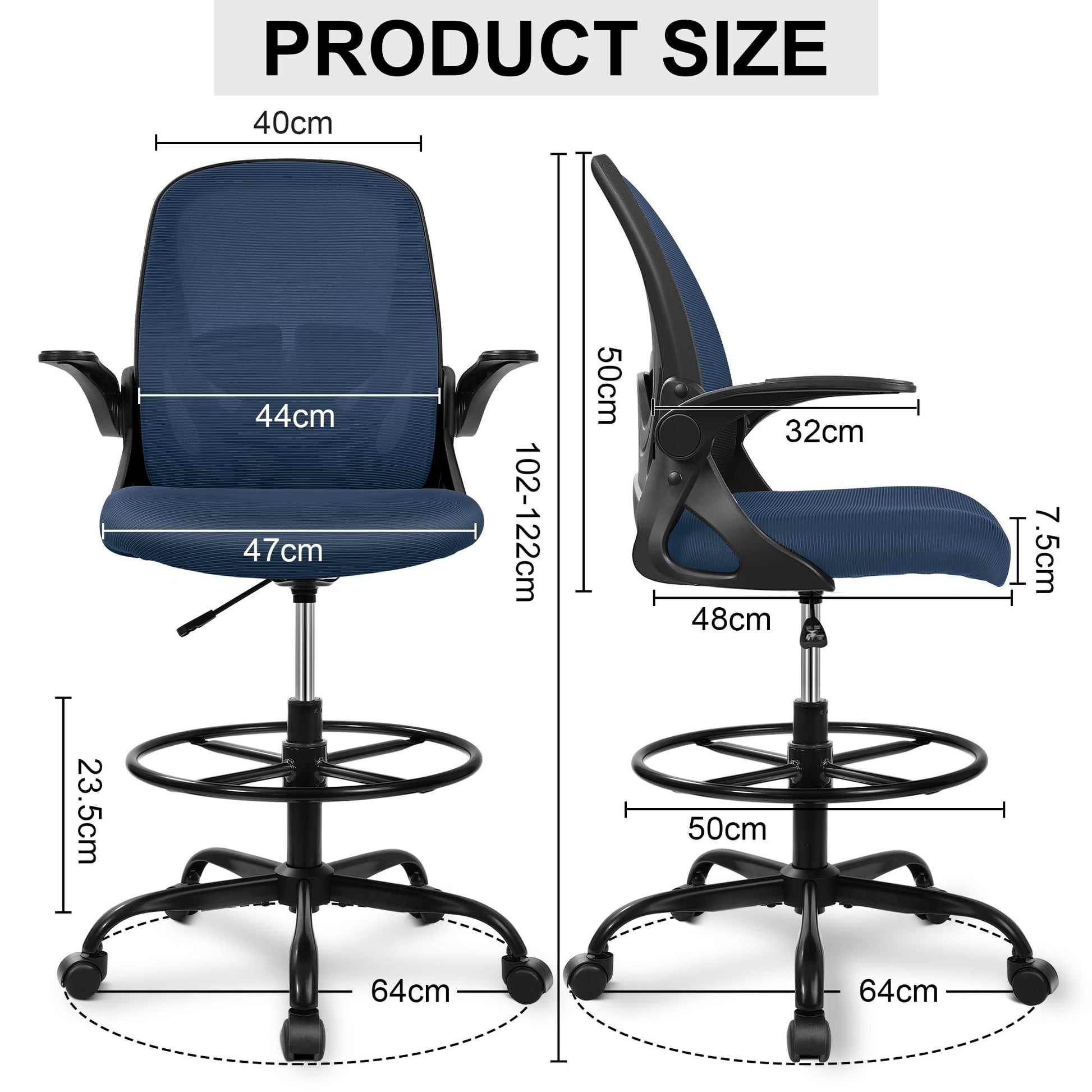 Drafting Chair, Tall Office Chair Ergonomic Standing Desk Chair,with Adjustable Footrest Ring, 3D Lumbar Support, Flip-up Armrests, Swivel Desk Stool for Drawing Working Navy
