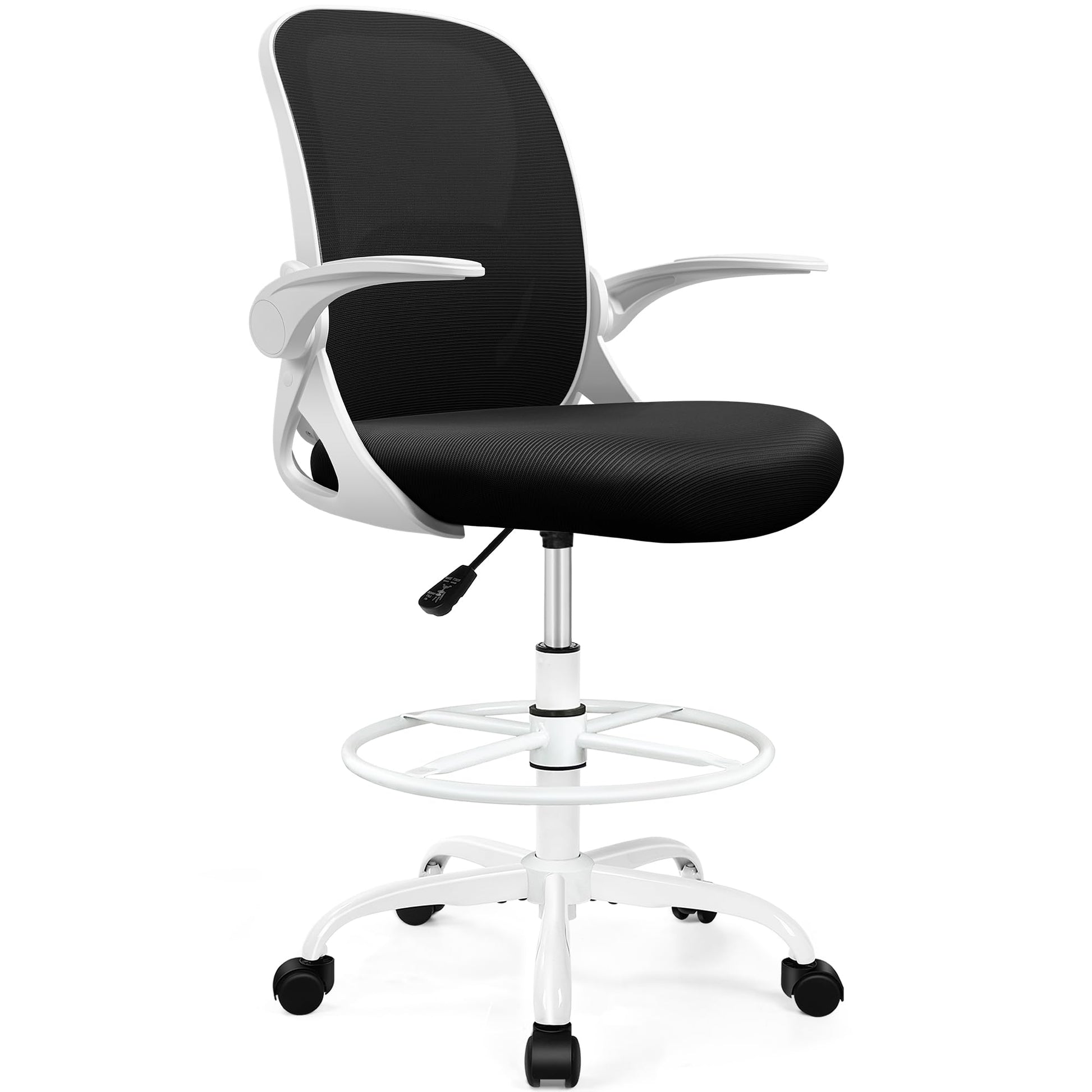 Drafting Chair Tall Office Chair with Flip-up Armrests, Adjustable Height, and Enhanced Lumbar Support - Ergonomic Rolling Stool, Back Support, and Adjustable Foot Rest Ring for Standing Desk White