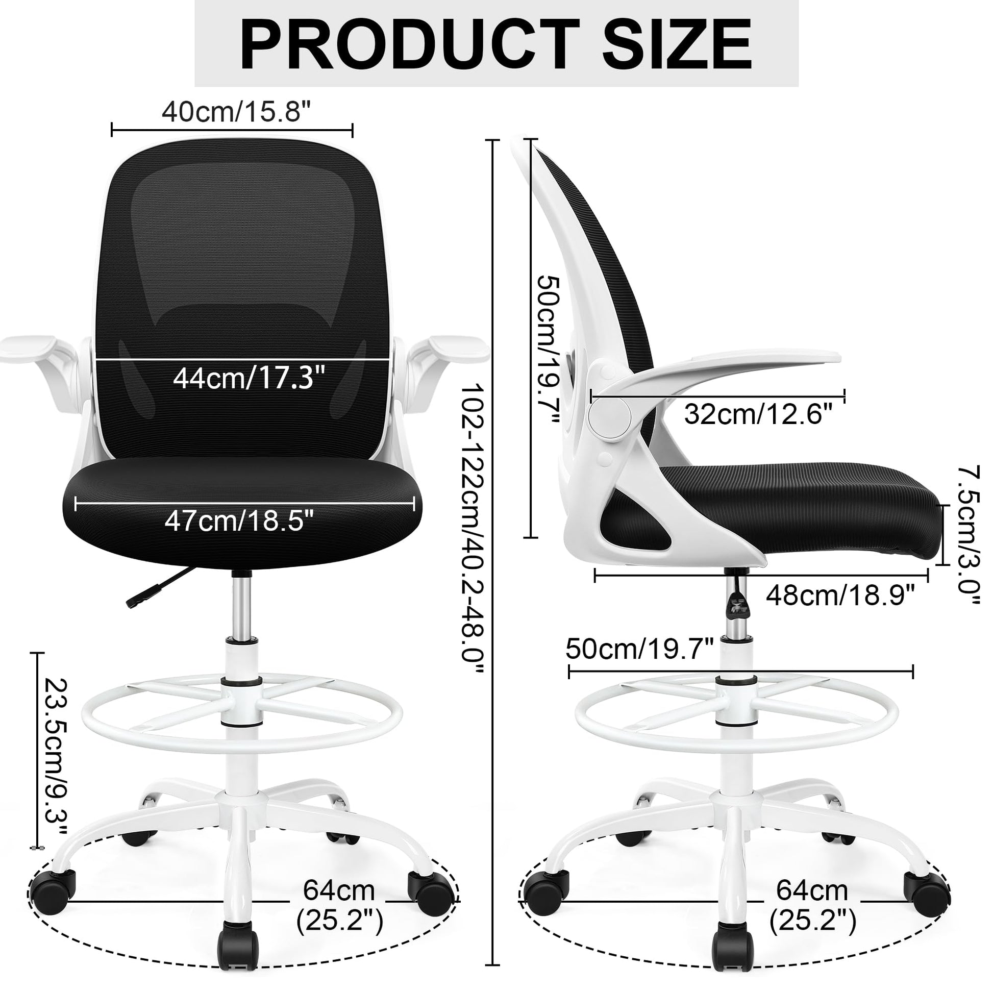 - Versatile and Adjustable Workspace Solution: This ergonomic drafting chair by Primy is perfect for various workspace environments, including standing desks, sitting desks, and bars. It features flip-up armrests for space-saving convenience, an adjustable height mechanism, and a foot rest ring for enhanced comfort and circulation
