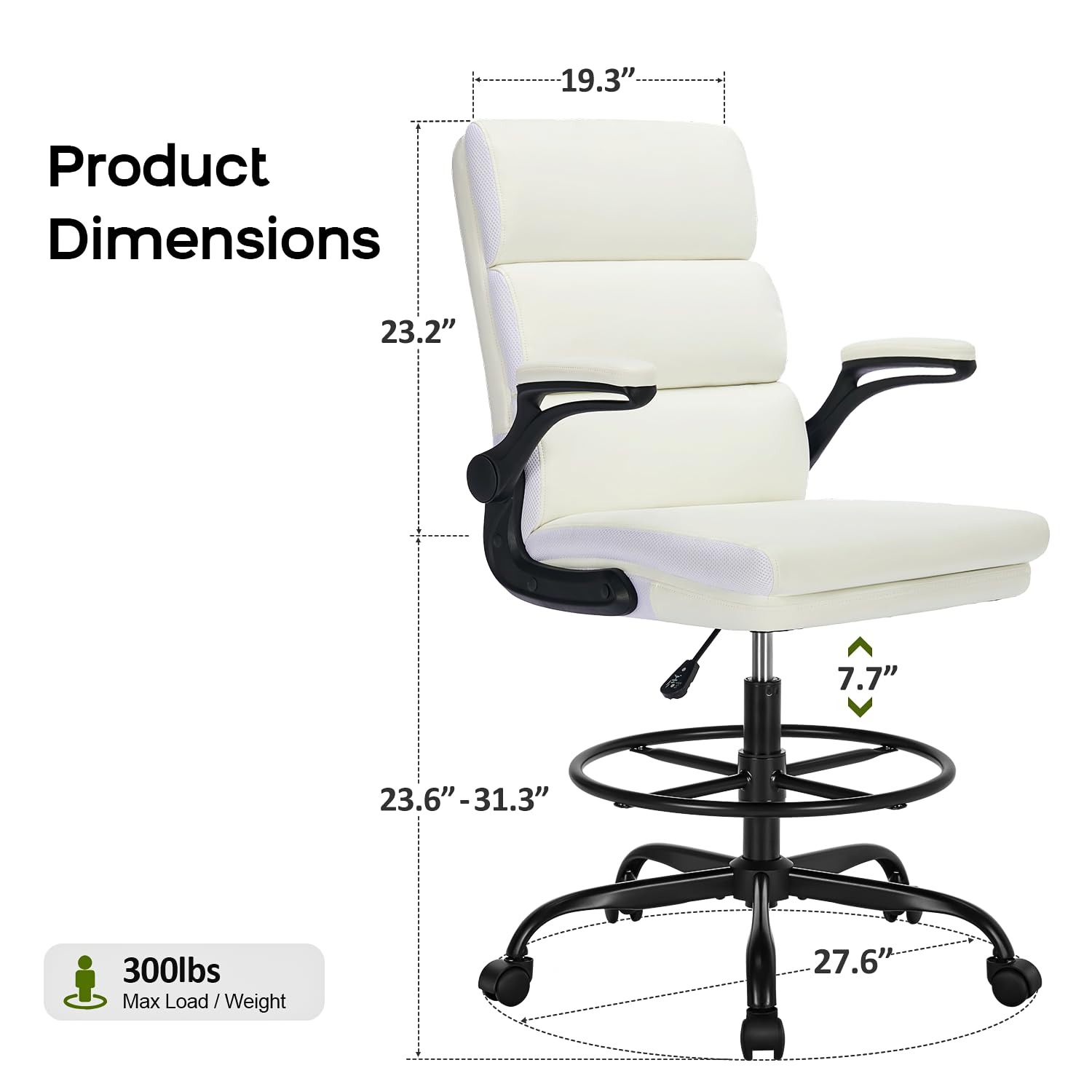 Drafting Chair Tall Office Chair with Padded Flip-up Armrests Executive Ergonomic Computer Standing Desk Chair with Comfortable Leather Backrest and Adjustable Footrest Ring (White)