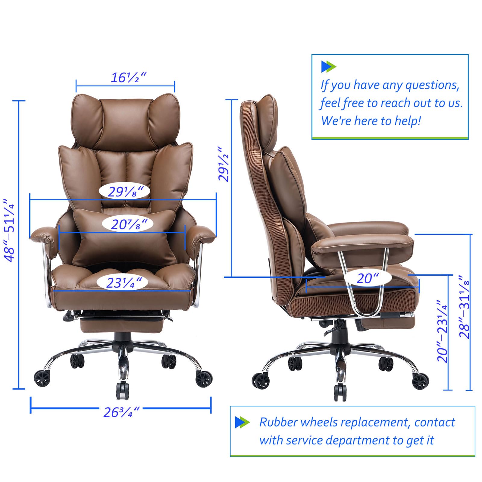 - HEAVY-DUTY LEATHER OFFICE CHAIR— The big and tall office chair, featuring a heavy-duty metal base, is designed to accommodate individuals weighing up to 400 lbs. The comfy office chair boasts a big high back chair design and is upholstered in leather, providing both style and comfort. The executive office chair is equipped with an oversized seat cushion (seat size: 20"D X 23.2"W, 4" thick), ensuring ample space and support.