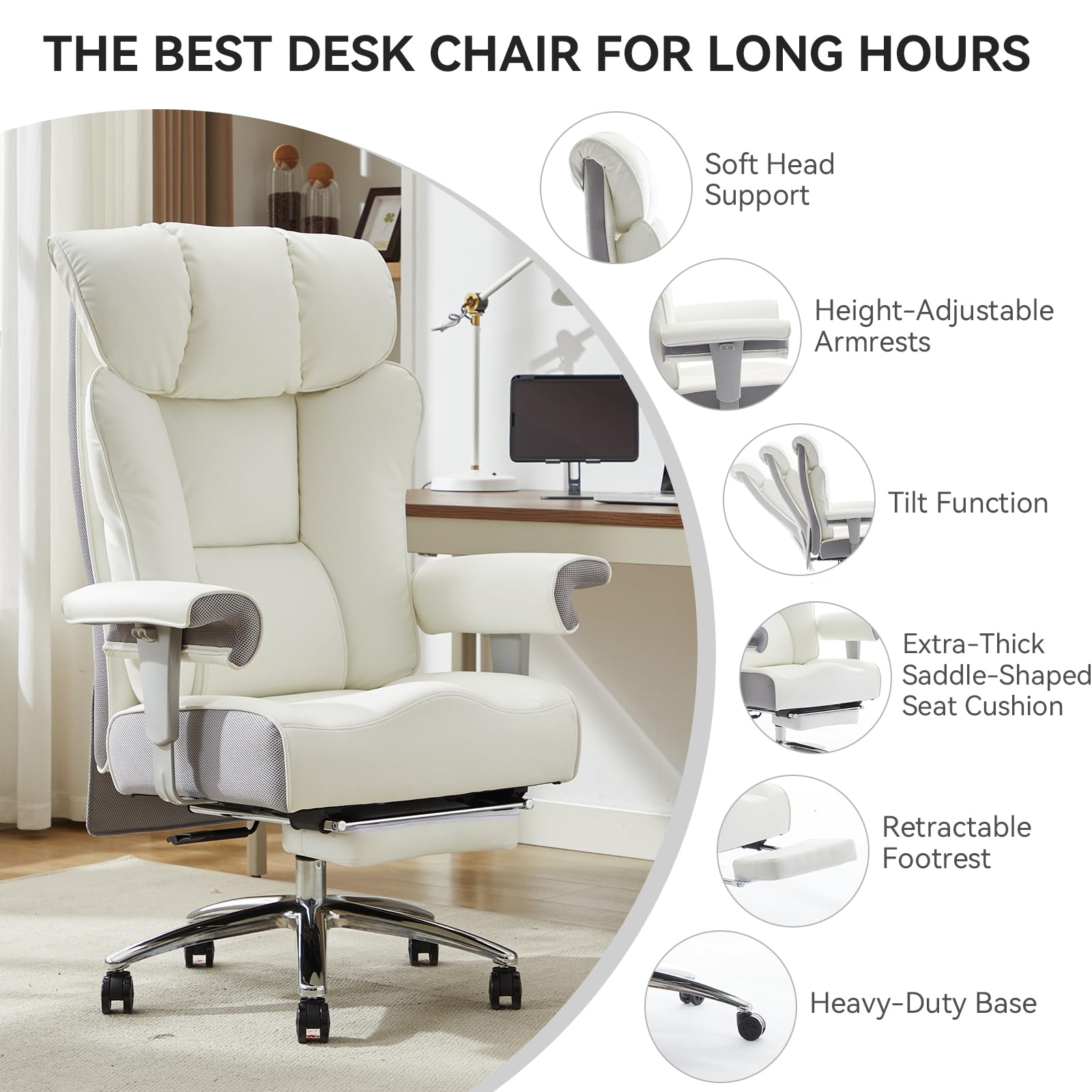 Efomao Big and Tall Office Chair 450LBS with Foot Rest, High Back PU Leather Executive Office Chair with Adjustable Padded Armrests, Lumbar Support for Home or Work, Heavy Duty Computer Chair, White