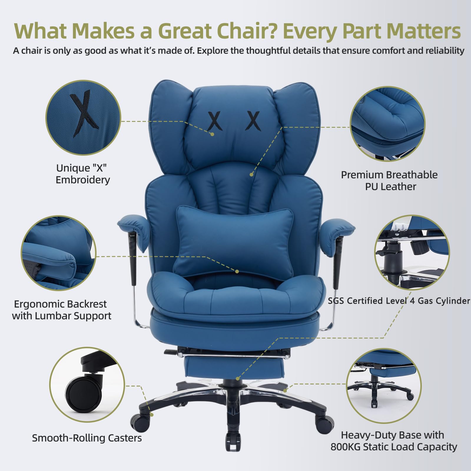 Efomao Big and Tall Office Chair with Footrest – High Back Computer Chair with Adjustable Armrests,Executive Office Chair with Wide Seat, Modern Desk Chair for Home Office, Gaming, or Study, Blue