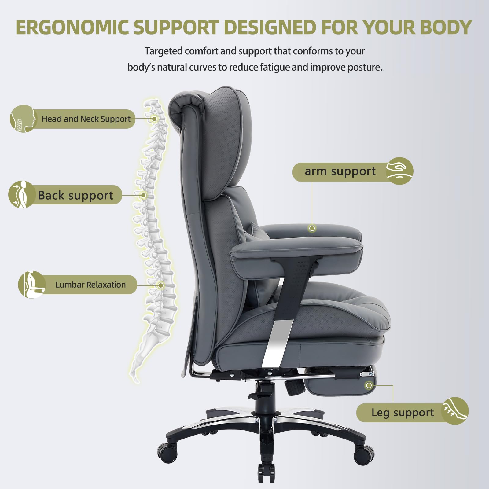- Ergonomic Office Chair for Ultimate Comfort: This high-back office chair is designed to follow the natural curve of your spine, helping reduce back strain and fatigue during long hours of sitting. This office chair with lumbar support includes a thick headrest and padded lumbar pillow for enhanced neck and lower back comfort.The big and tall office chair with an extra-wide, deep seat cushion offers a custom fit for optimal comfort. Ideal as a computer chair, gaming chair, executive office chair.