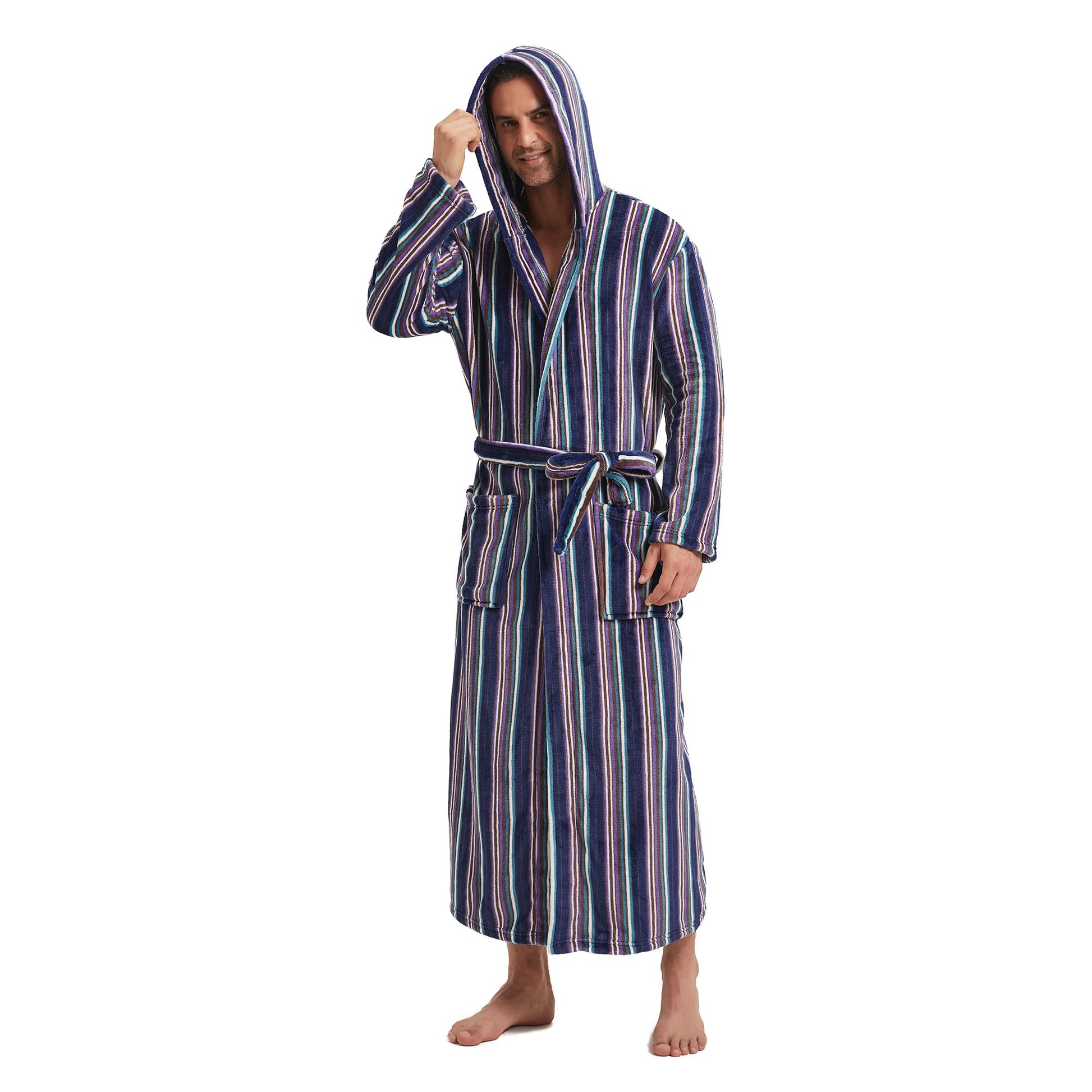 - 【Full-Length Robes with Hood】FashGudim mens full length stripe robes are made of 100% polyester,It is medium thickness,feels warm and cozy. Our mens hooded robes range between 57 and 59 inches, which can insulate your body from the winter chill, while wrapping you in incredible softness,it is perfect for snuggling before bedtime or lounging around the house.