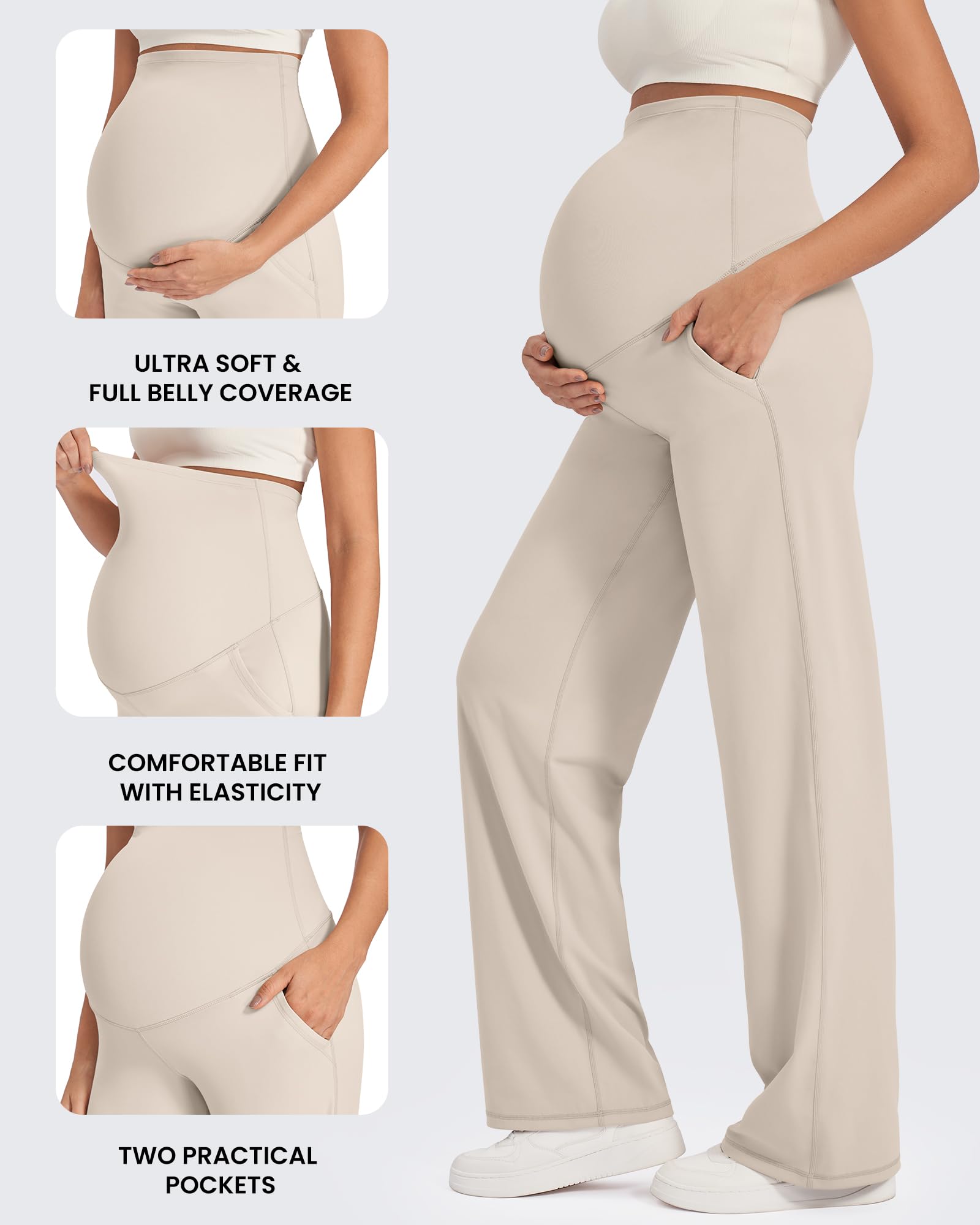 G4Free Maternity Pants for Work with Pockets Soft Pregnancy Fall Clothes Straight Legs Yoga Dress Trousers for Casual(Light Khaki,L,34")
