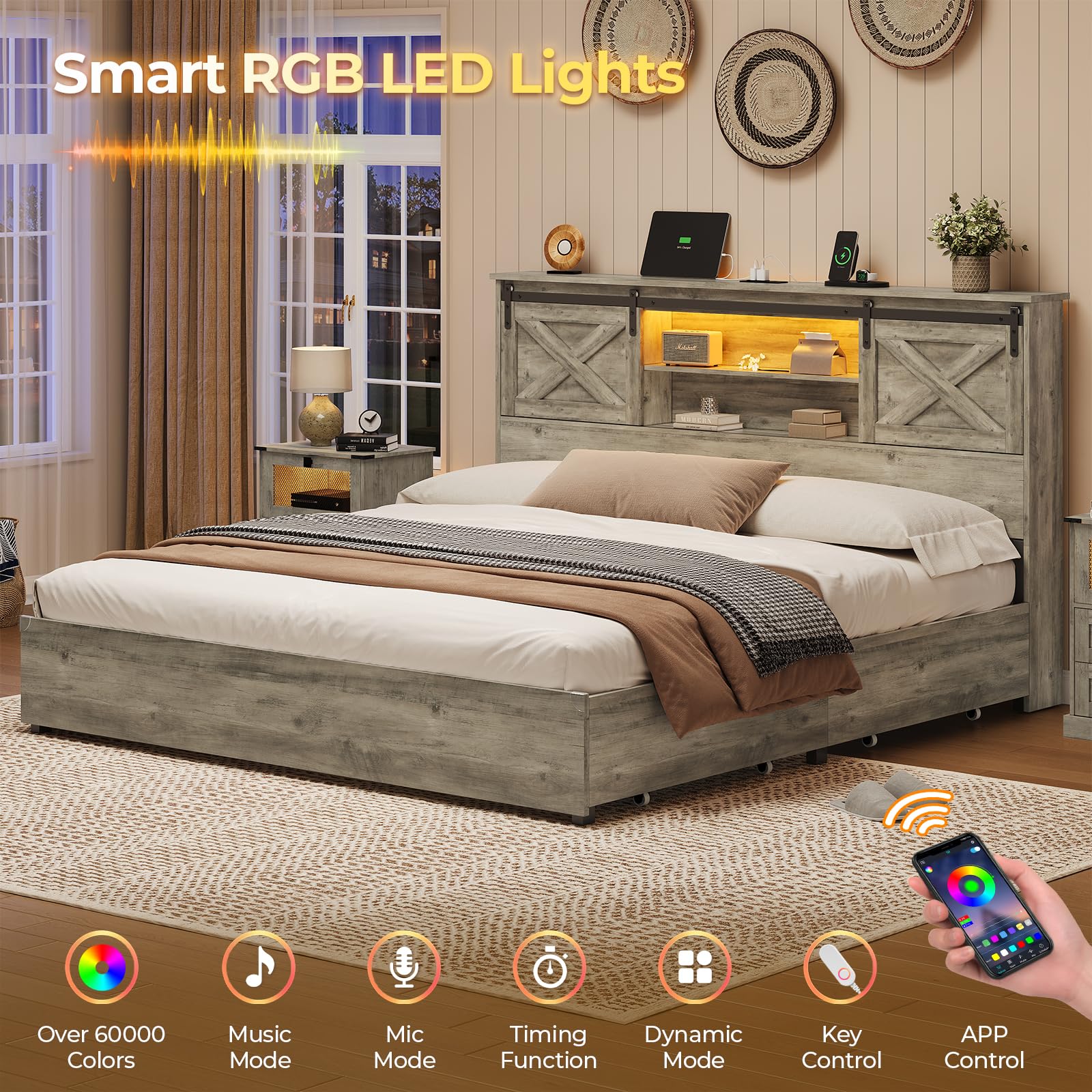 Hasuit Farmhouse Bed Frame California King Size with 4 Storage Drawers, Wooden Platform Cal King Beds with Charging Station and LED Lights, Rustic Bed with Storage Headboard and Sliding Barn Door