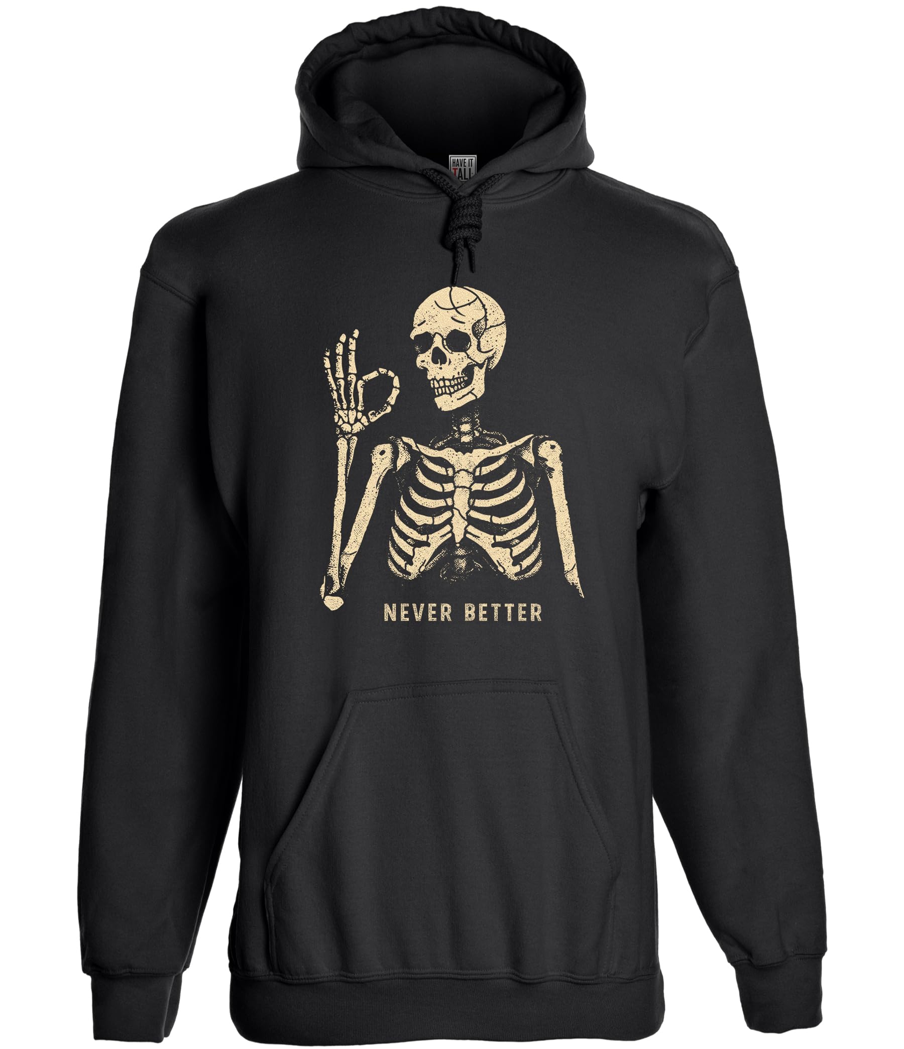 How are you doing? Never Better! Printed with soft hand inks on soft cotton/polyester heavyweight fleece. Long lasting design will not crack or peel even after many washes.
