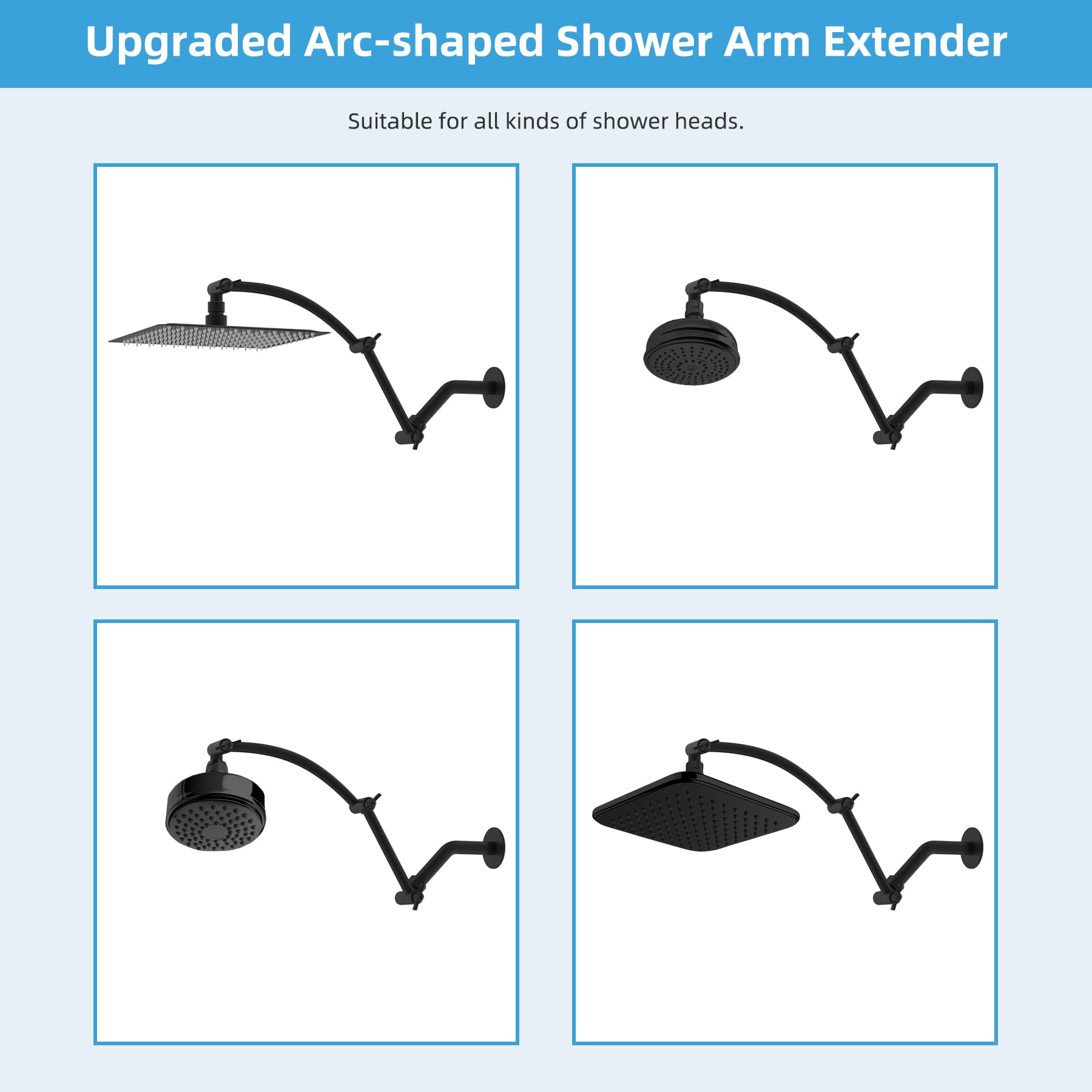 - Upgraded 16'' Shower Extension Arm: Height & angle adjustable arc-shaped design enhances its bearing capacity, high rise your shower head to achieve vertical water. Compared with the regular shower arm extender, the Hibbent shower arm extension can raise the shower head higher or lower and keep the shower head in a horizontal position all the way. The shower head is always vertical in your large size and will not hit the shower arm, instead of sloping water like an ordinary straight shower arm