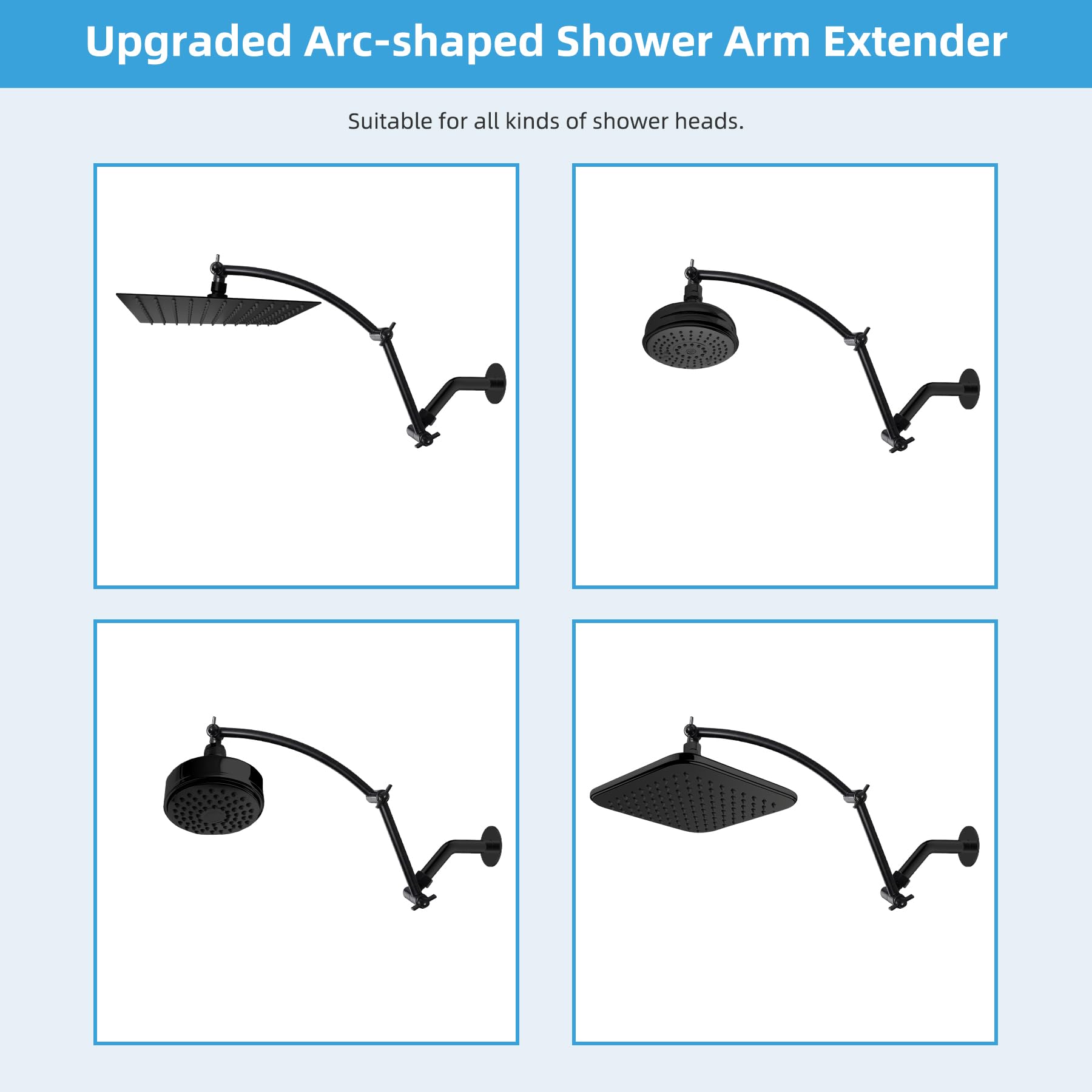 - Upgraded 16'' Shower Extension Arm: Height & angle adjustable arc-shaped design enhances its bearing capacity, high rise your shower head to achieve vertical water. Compared with the regular shower arm extender, the Hibbent shower arm extension can raise the shower head higher or lower and keep the shower head in a horizontal position all the way. The shower head is always vertical in your large size and will not hit the shower arm, instead of sloping water like an ordinary straight shower arm