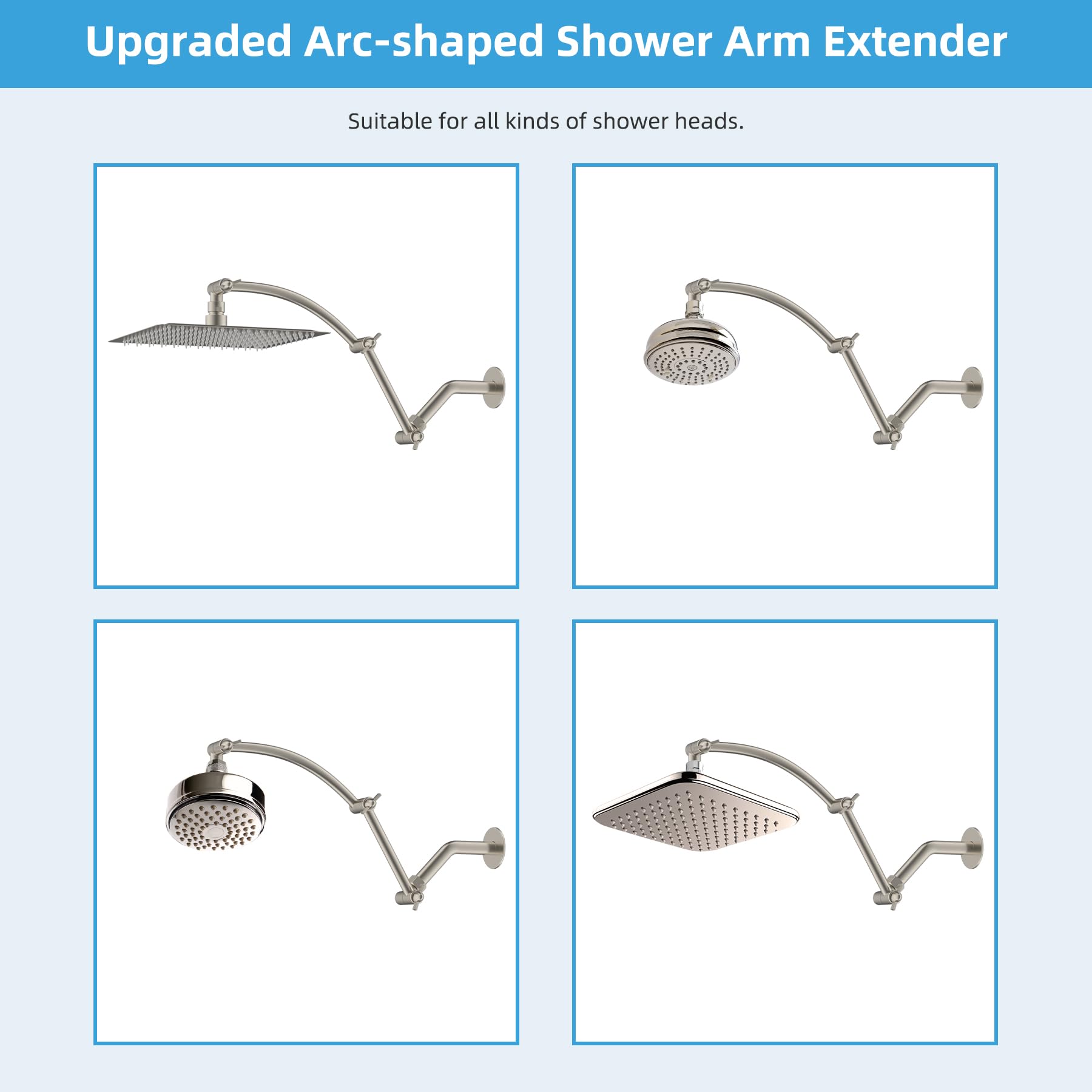 - Upgraded 16'' Shower Extension Arm: Height & angle adjustable arc-shaped design enhances its bearing capacity, high rise your shower head to achieve vertical water. Compared with the regular shower arm extender, the Hibbent shower arm extension can raise the shower head higher or lower and keep the shower head in a horizontal position all the way. The shower head is always vertical in your large size and will not hit the shower arm, instead of sloping water like an ordinary straight shower arm