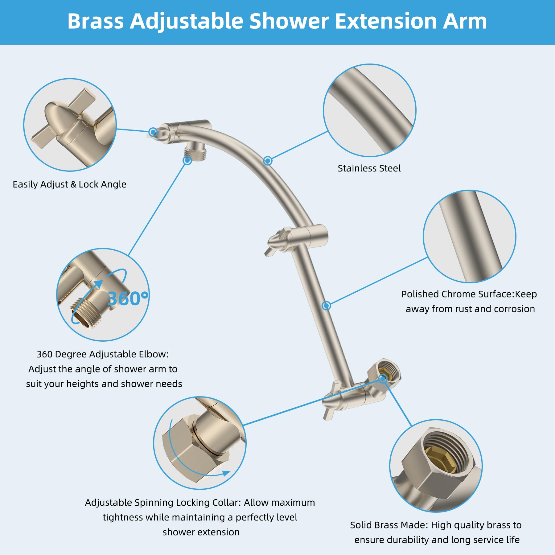 Hibbent Shower Head Extension Arm,16" Solid Brass Adjustable Extender with Lock Joint, Standard 1/2", Rise or Lower Rainfall and Fixed Shower Head,Height/Angle Adjustable Extension Arm, Brushed Nickel