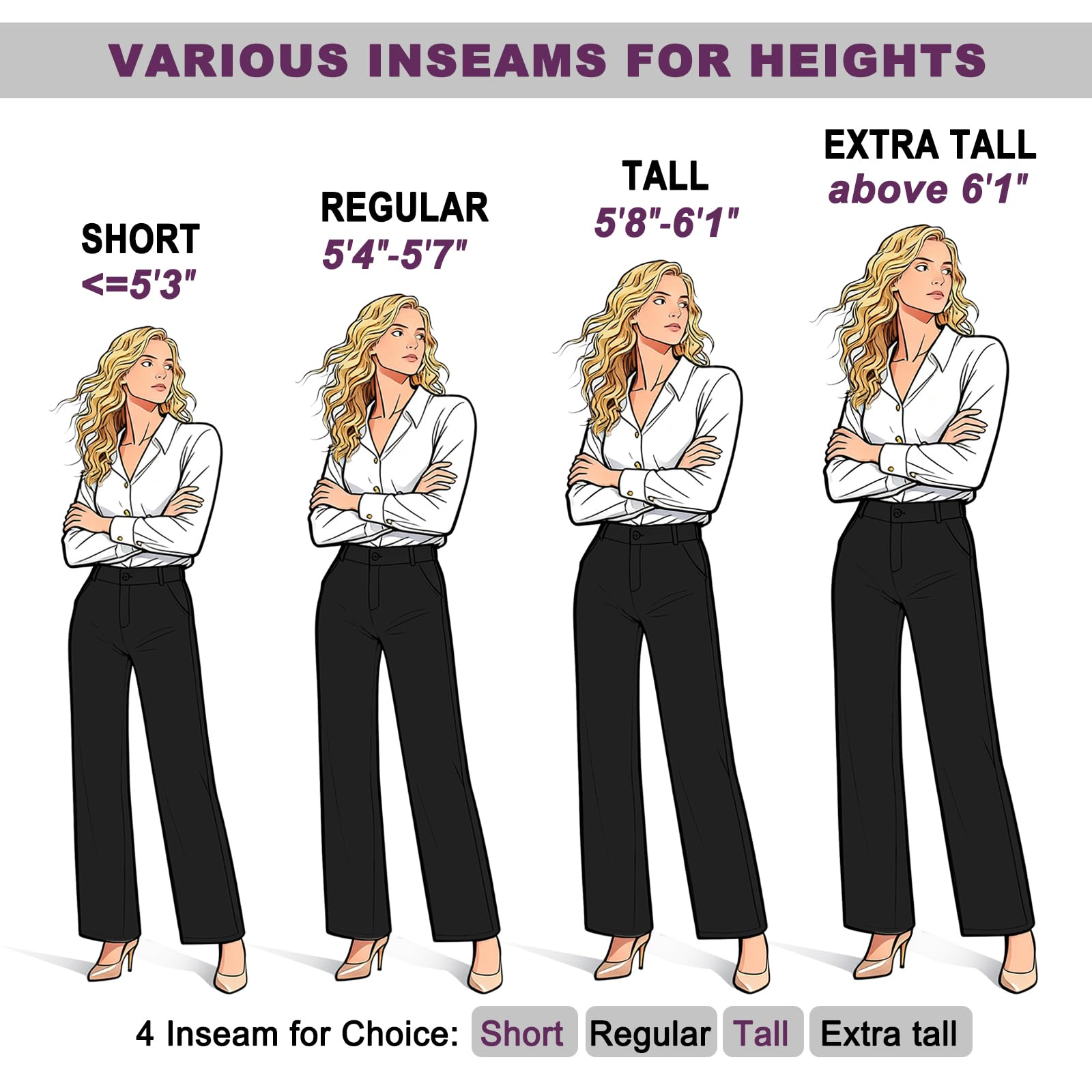 - Elevate Your Style with High Waisted Wide Leg Pants: Featuring a convenient zipper and button closure for ease and style, two real/functional front slant pockets and without rear pockets, front and back belt loops. Choose between wide leg dress pants or straight leg trousers with real front pockets for added convenience. Short inseam length is 28" - 29" / Regular inseam length is 30" / Tall inseam length is 32" - 33"/ Extra Tall inseam length is 35".