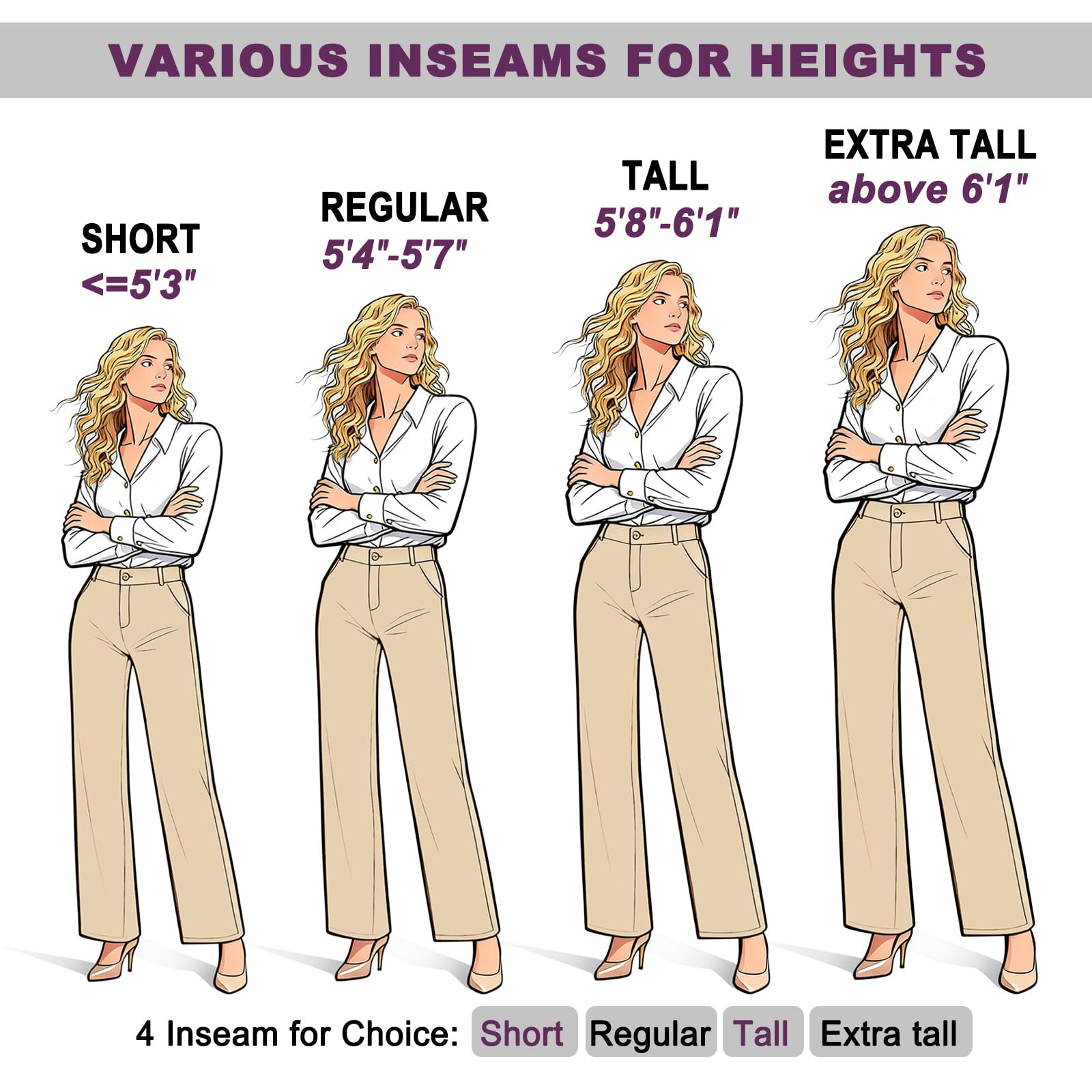 - Elevate Your Style with High Waisted Wide Leg Pants: Featuring a convenient zipper and button closure for ease and style, two real/functional front slant pockets and without rear pockets, front and back belt loops. Choose between wide leg dress pants or straight leg trousers with real front pockets for added convenience. Short inseam length is 28" - 29" / Regular inseam length is 30" / Tall inseam length is 32" - 33"/ Extra Tall inseam length is 35".