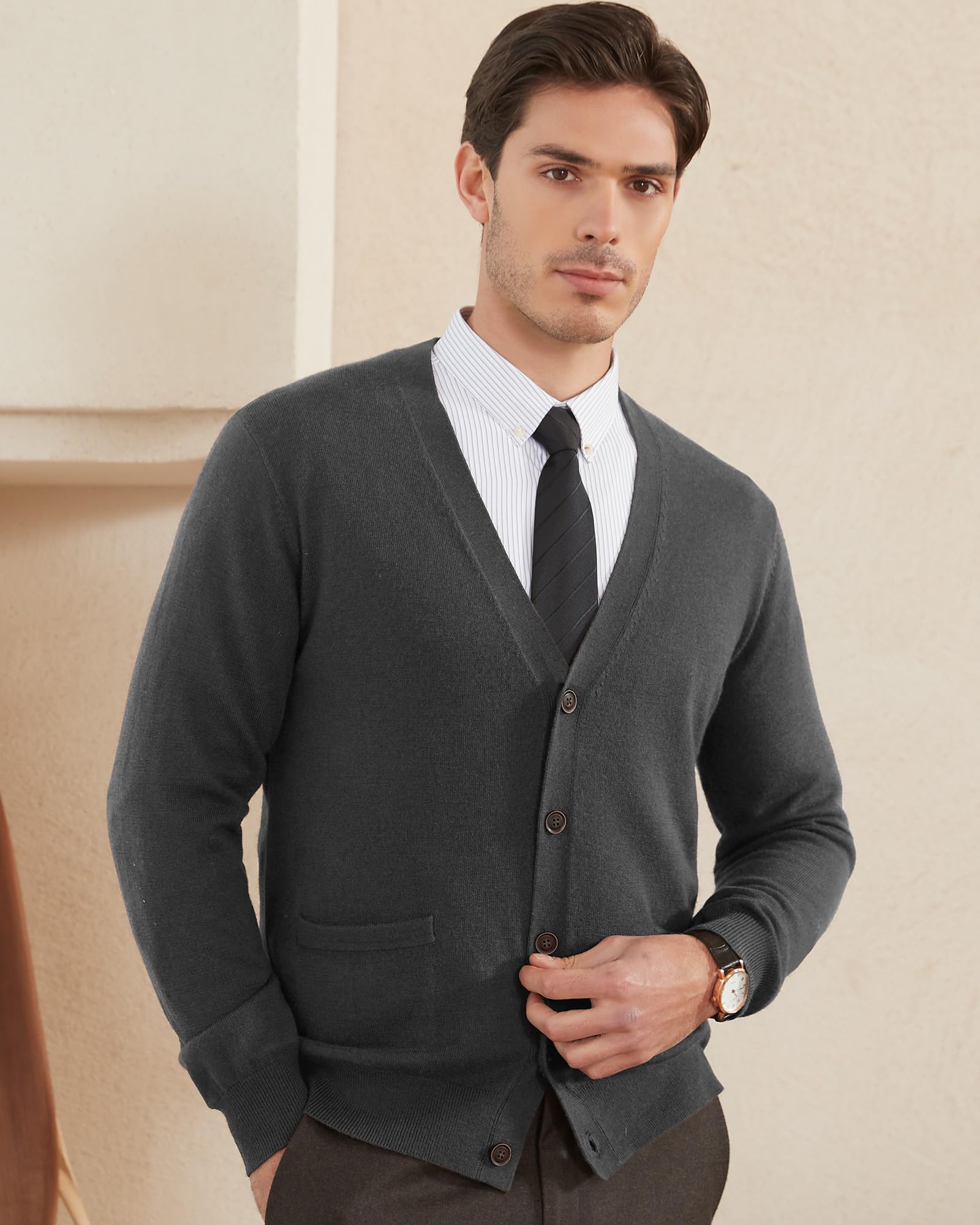 Kallspin Men's Tall Cardigan Sweaters Wool Blend V Neck Button Down Sweaters with Pockets(Charcoal, L-Tall)