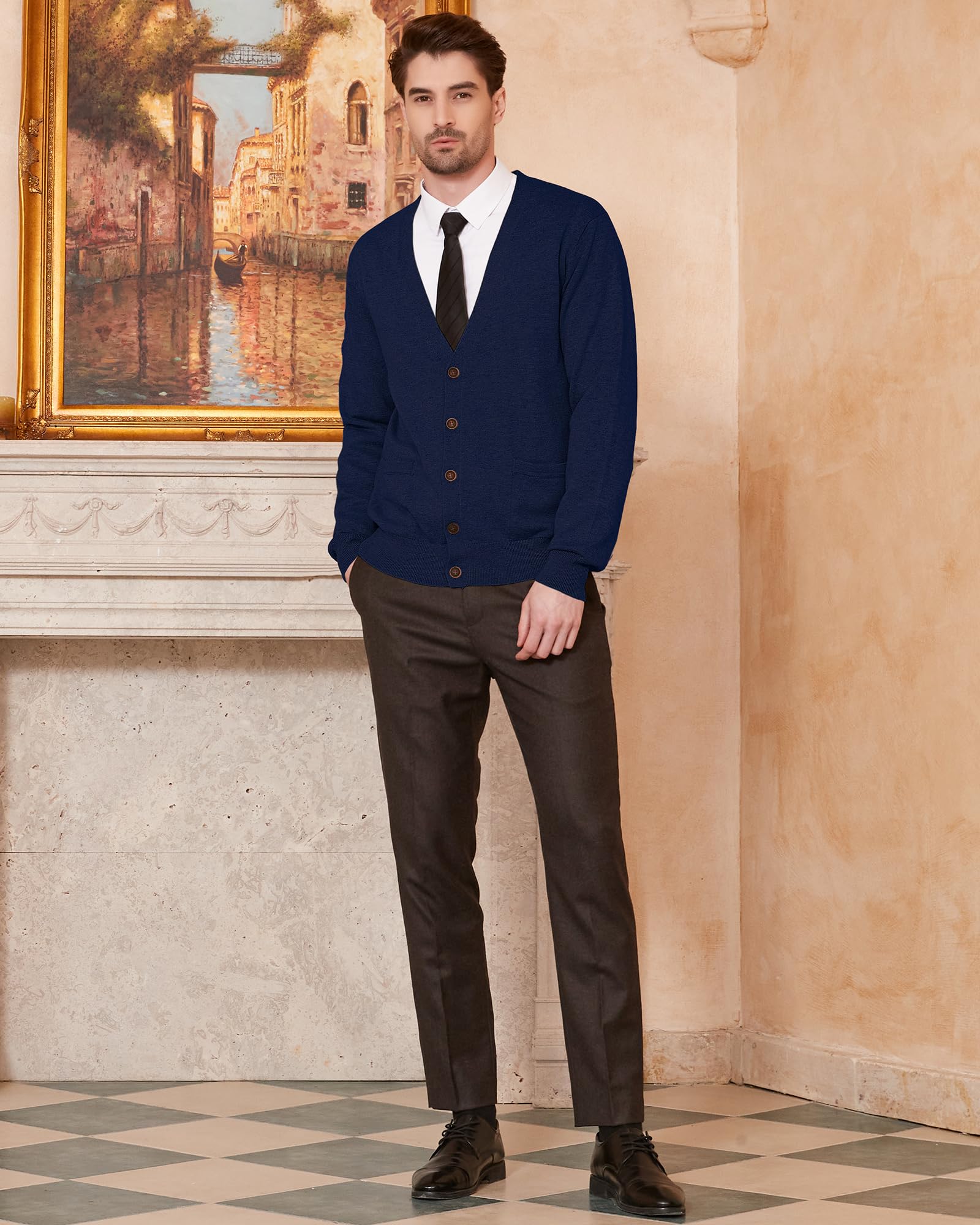 Kallspin Men's Tall Cardigan Sweaters Wool Blend V Neck Button Down Sweaters with Pockets(Navy Blue, 3XL-Tall)