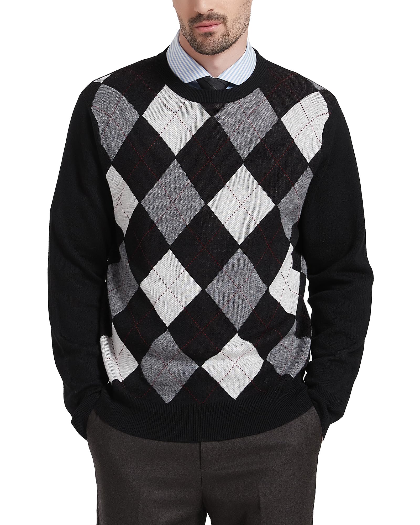 Kallspin Men's Wool Blend Crewneck Sweater Argyle Long Sleeve Pullover Sweater for Casual Or Dressy Wear(Black,XL-Tall)