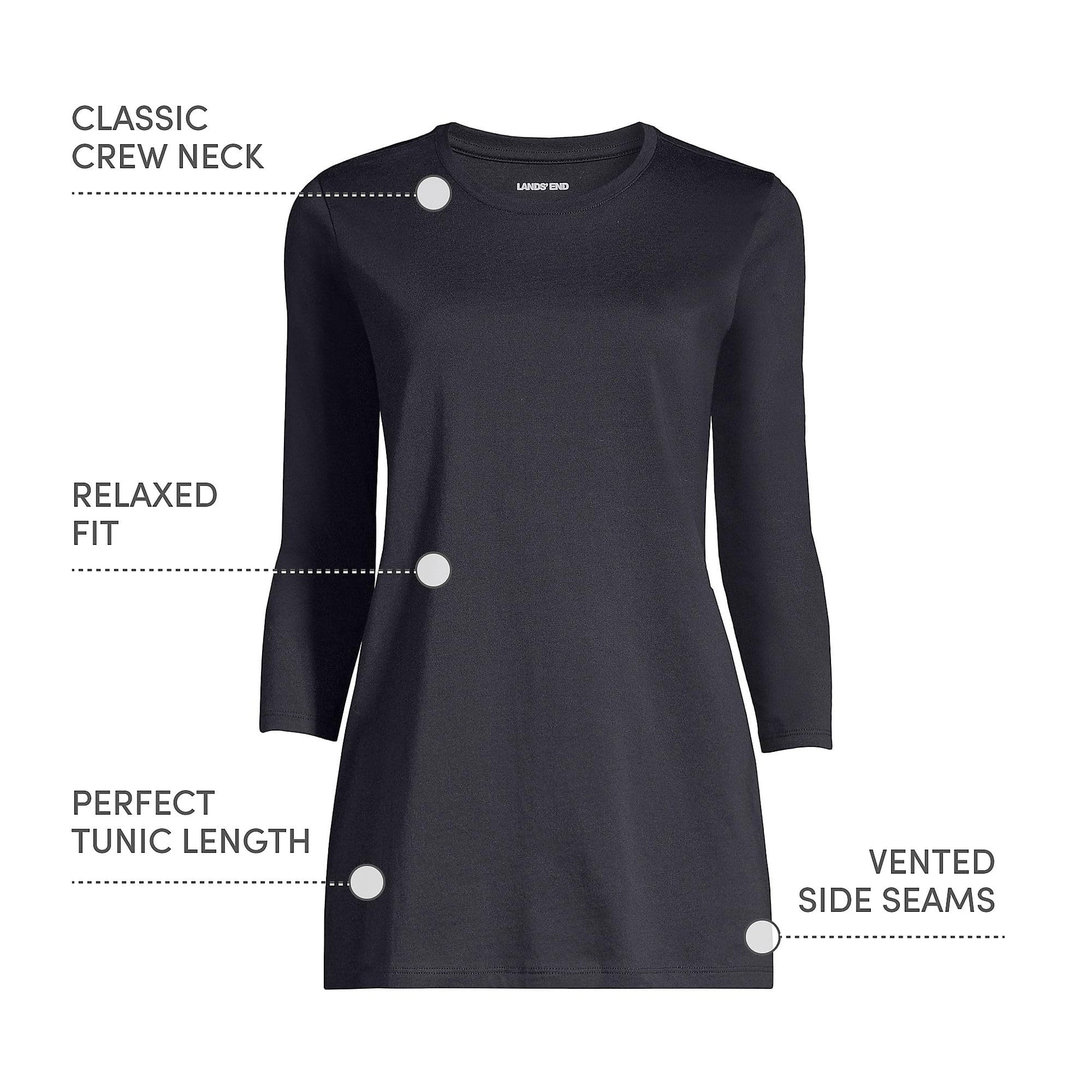 In need of a breathable super-soft and comfy layering tee to get you through the seasons? Look no further than the Lands’ End Women’s ¾ Sleeve Supima Cotton Crewneck Tunic. Made from top-tier American grown cotton Supima is a longer and stronger fiber that resists shrinkage pilling and wrinkles. Ideal for layering underneath sweaters jackets sweatshirts blazers fleece and puffy winter coats you can wear this long tunic just about anywhere during any season. Of course the loose relaxed fit and vibrant colors also make it a cute choice to wear alone with jeans leggings dress pants or a skirt for a day at the office or simply lounging around the house. Designed with your comfort in mind the jersey knit fabric and 100% cotton guarantee means that this will be one of the softest shirts you own. And the variety of colors and patterns ensure it to be one of the most stylish! Lands' End creates and manufactures quality clothing to last a lifetime of comfort and style.