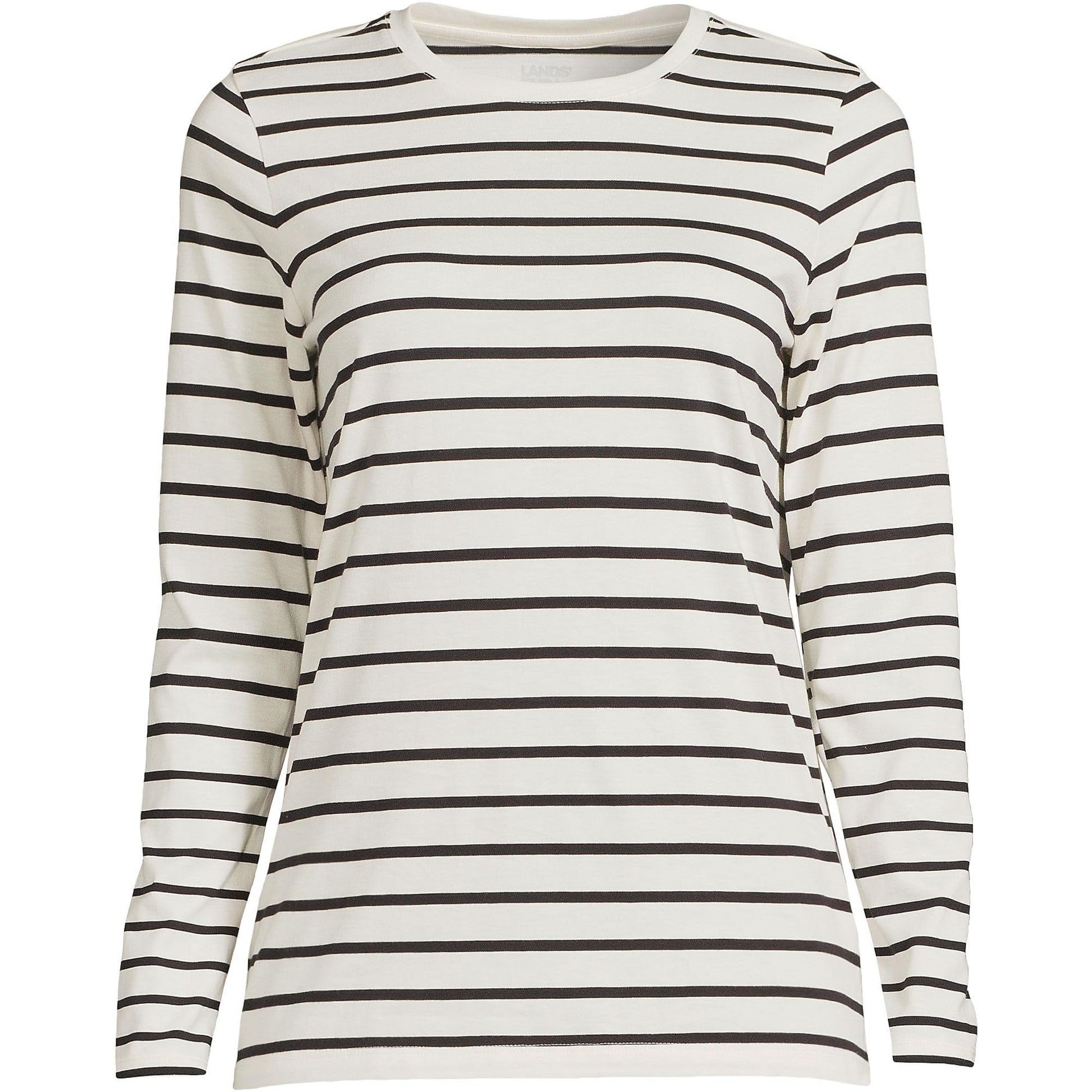Lands' End Womens Long Sleeve Relaxed Supima Cotton Crew Neck T Shirt Ivory/Black Breton Stripe Tall Large