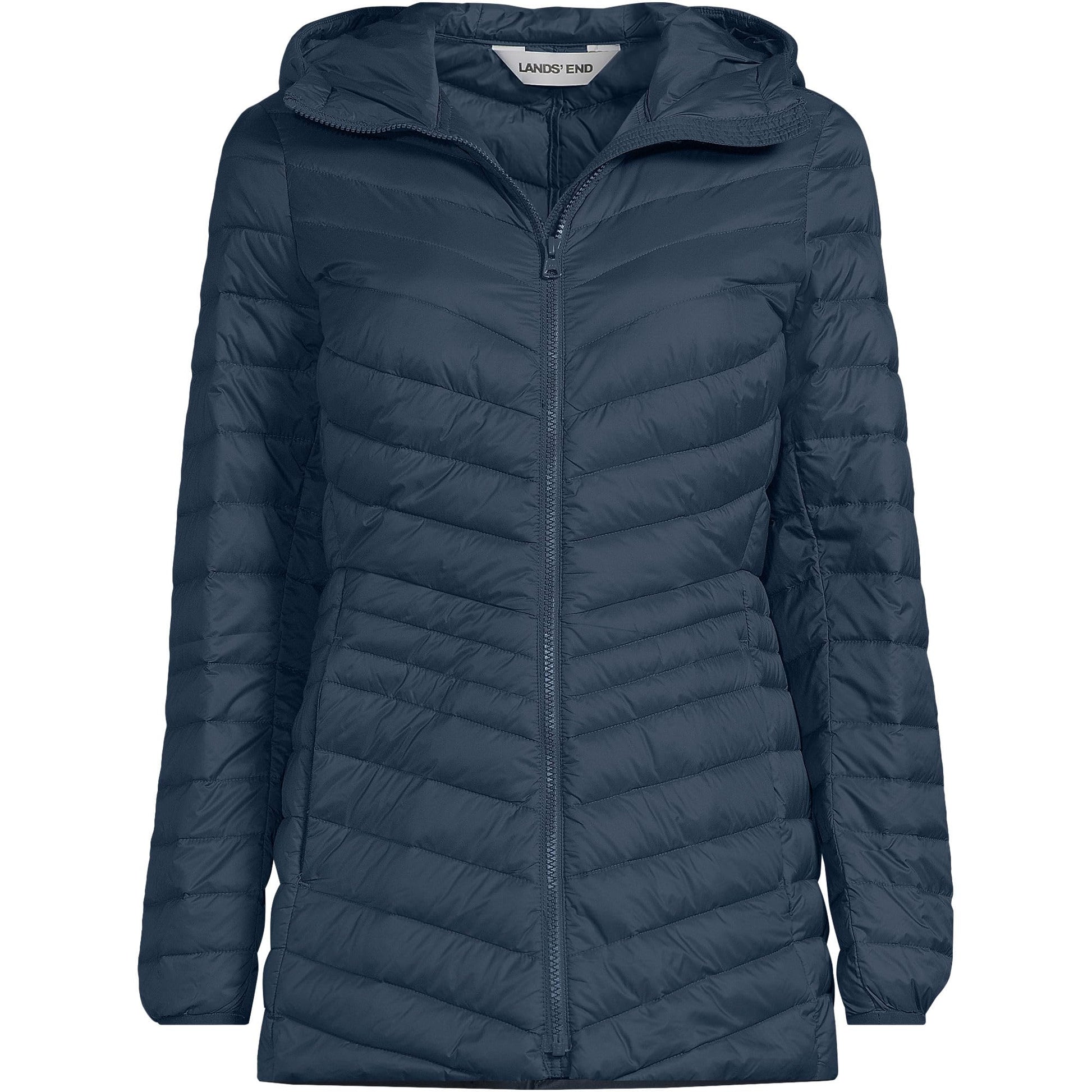 Lands' End Womens Packable Chevron Hooded Long Wanderweight Down Jacket Vintage Blue Tall X-Large