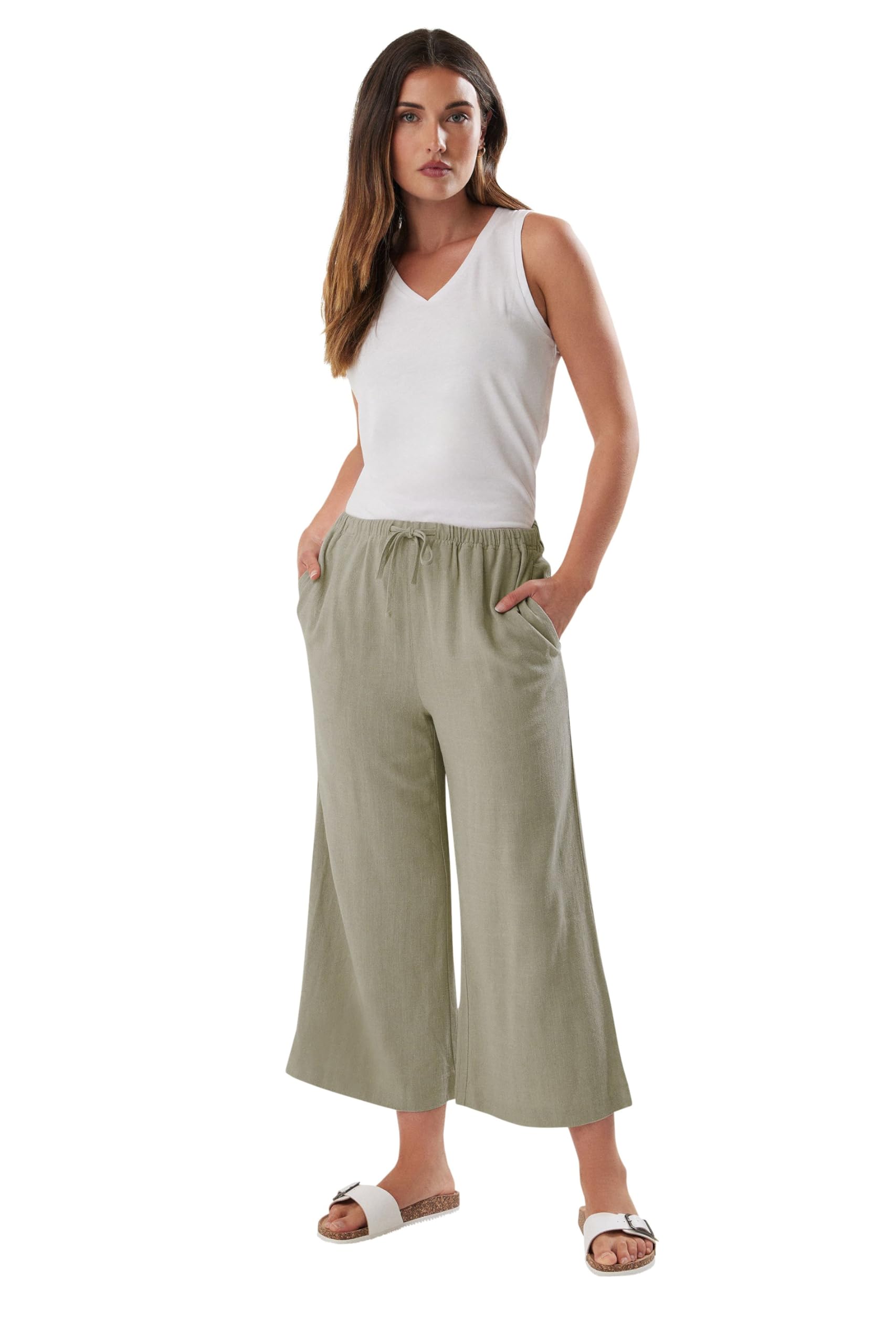 - Elevate your summer wardrobe with these cropped Pants. Made from a soft woven fabric containing linen, they feature a wide-leg style, two side pockets and an elasticated waistband with a tie fastening. Pair with a Undershirt top and sandals for a stylish casual look, perfect for your next holiday.