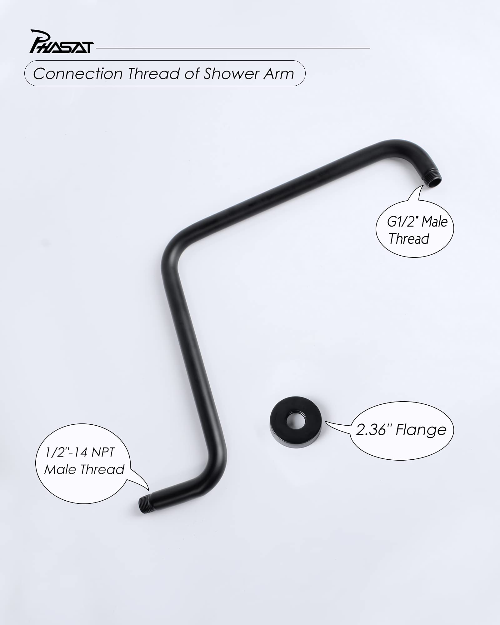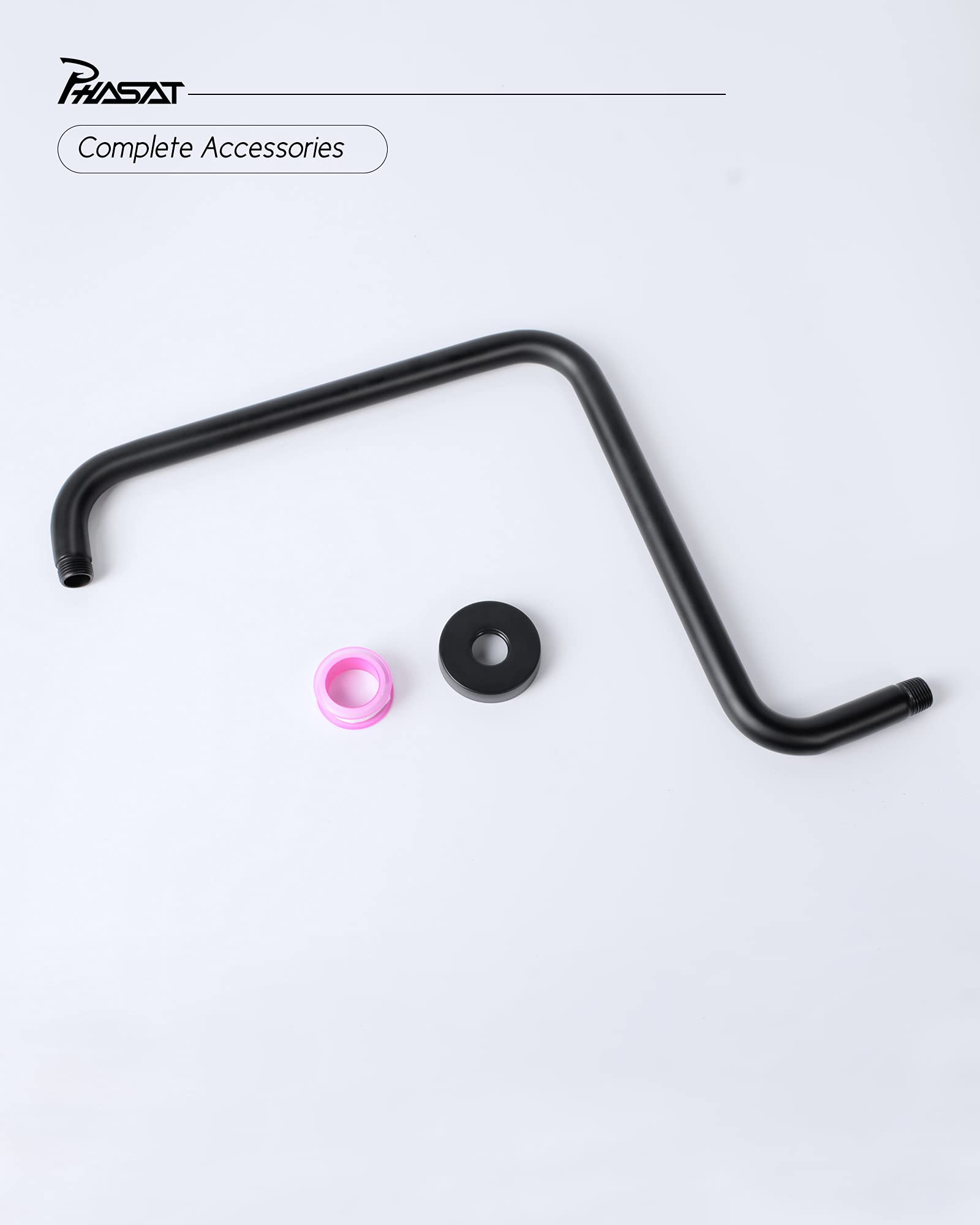 PHASAT 16 Inches Black Shower Head Arm,S Shaped Shower Arm with Flange,High Rise Shower Head Extension Matte Black,PU9H02