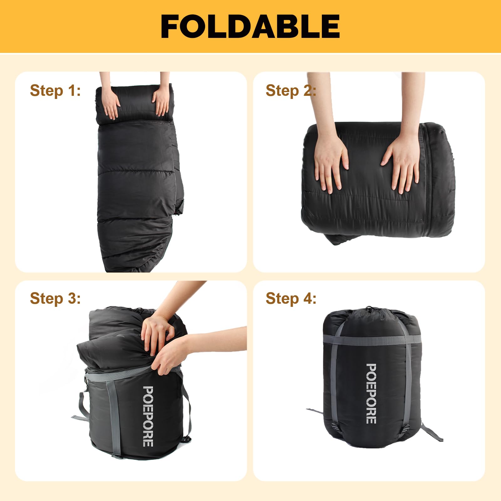 - More Spacious: POEPORE sleeping bag has dimensions of (78.74+11.81)*35.43 inches and a packed size of 16.53*13.38*5.51 inches. The sleeping bag features an enlarged and widened design, providing ample space that suits various body types, including even XXL sizes, allowing freedom of movement and ensuring comfort.