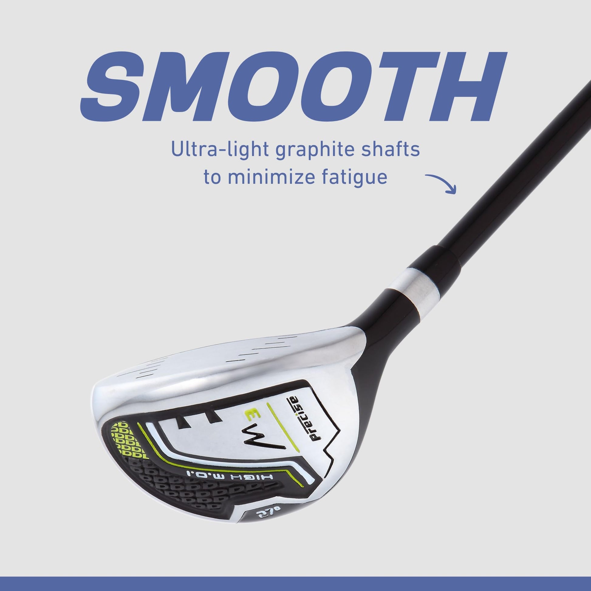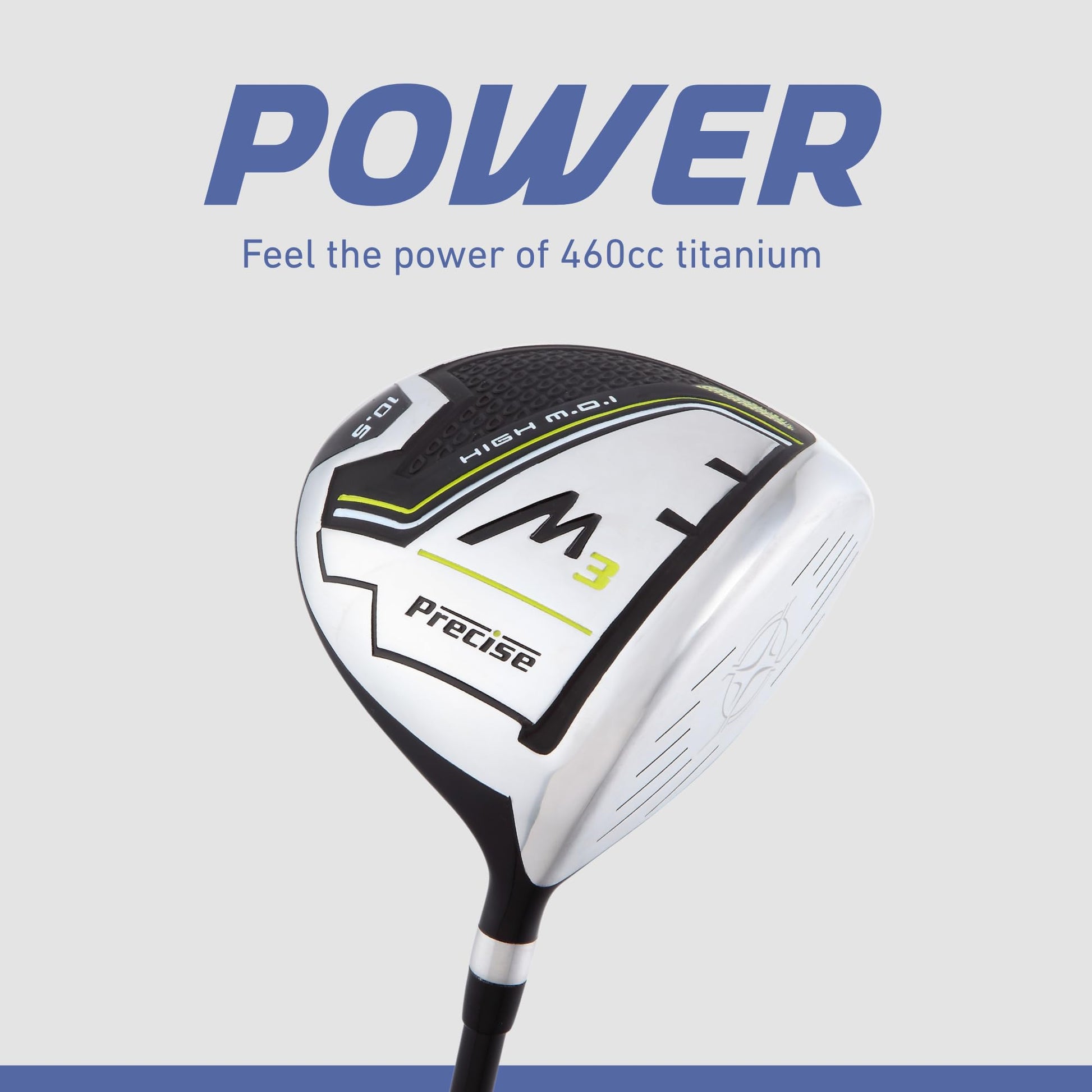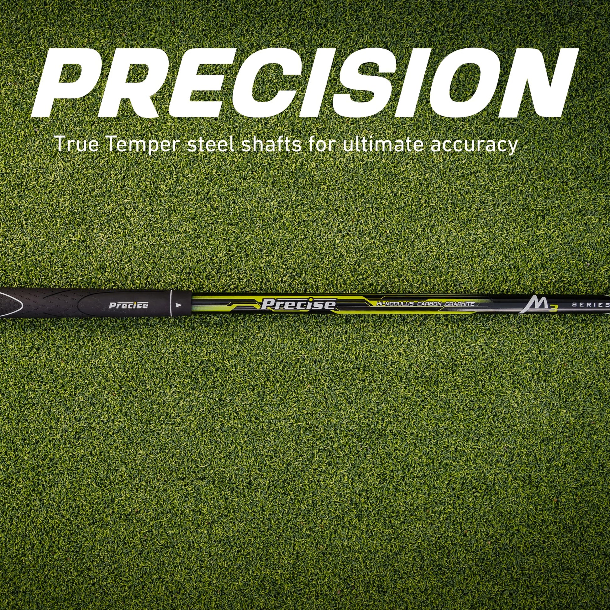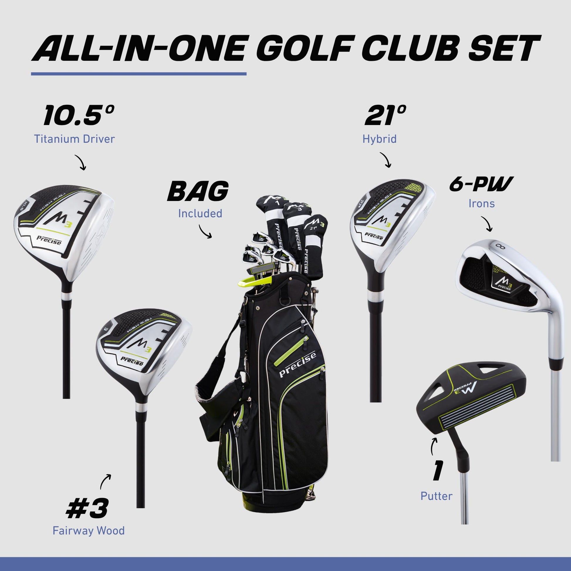 Details: Perfect Your Golf Game with the Precise M3 Golf Club SetsDrive, putt, and swing like a pro with the Precise M3 men’s golf club set. Striking the perfect blend of distance, forgiveness, and convenience, our complete golf club sets are designed to help you play your best game, right out of the box.Your Ticket to Straighter, More Powerful ShotsEverything you need to hit the course with confidence comes with our men’s golf set. Hit powerful, long-distance shots with the cutting-edge driver, and experience ultimate precision and forgiveness on the woods. And for higher launches with more controlled distances, the hybrid is your go-to. 6-PW irons deliver exceptional forgiveness and enhanced feel, helping you hit more precise shots with greater control. Plus, the golf club set for men features a well-balanced putter with an alignment aid, helping sink more putts and finish strong on each hole. Finally, the golf sets for men right handed come with a deluxe dual-strap golf bag for comfortable carrying, featuring a grab handle and rain hood for added protection. Elevate Your Game with our Mens Golf Club Sets Right Handed:✓ Smash it off the tee with a powerful driver for maximum distance.✓ 6-PW irons provide precision and consistency, ideal for hitting fairways.✓ Sink more putts with a balanced, alignment-focused putter.✓ Aerodynamic woods make it a breeze to hit straighter shots.✓ Comes with a deluxe dual-strap bag and grab handle for effortless transportation.Tailored to Your SizeOur right handed golf clubs for men come available in regular, petite, and tall sizes, designed to fit golfers of all heights. With the perfect combination of distance and forgiveness, this set is designed to help golfers of all skill levels master their game.