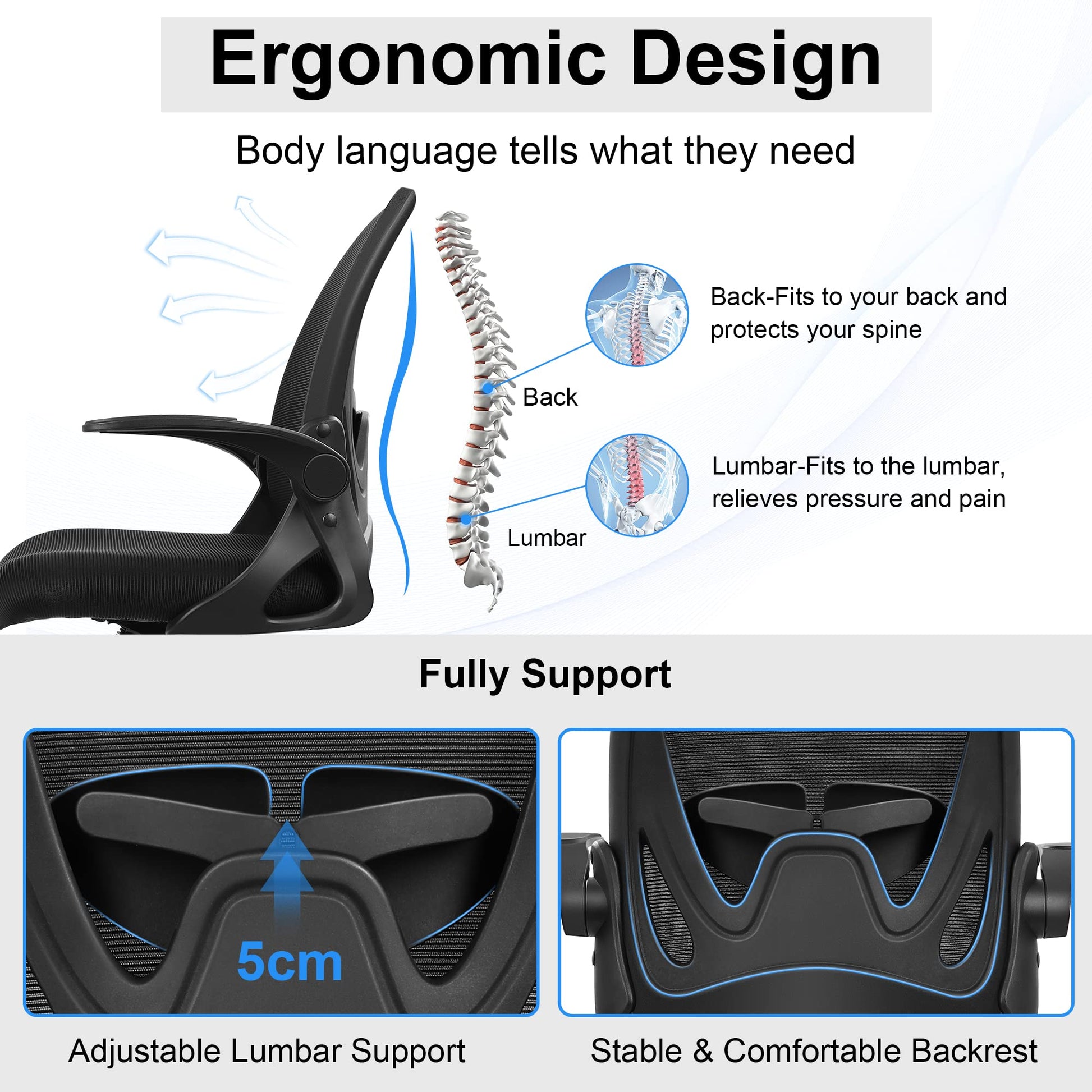 - Ergonomic office chair:This ergonomic chair has a curved backrest, which perfectly fits your body curve. There is an adjustable lumbar support in your back, which is designed to protect your spine and relieve back and spinal pain during long-term work. The design of cushion edge can relieve pressure and promote blood flow in your legs.