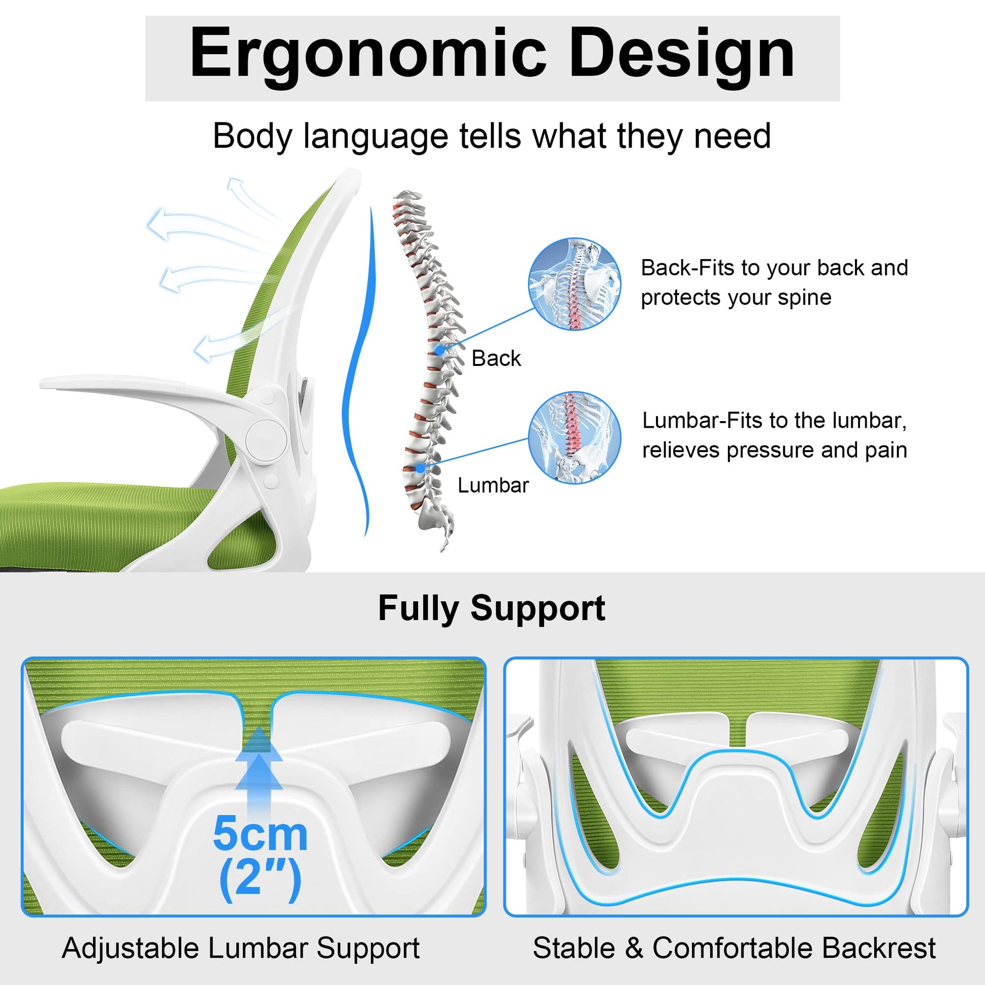 - Soft and Breathable: The mesh back and 3-inch thick seat cushion provide comfort and elasticity, reducing discomfort from extended sitting. High-density sponge filling and breathable mesh enhance breathability, preventing stuffiness, especially in warm weather