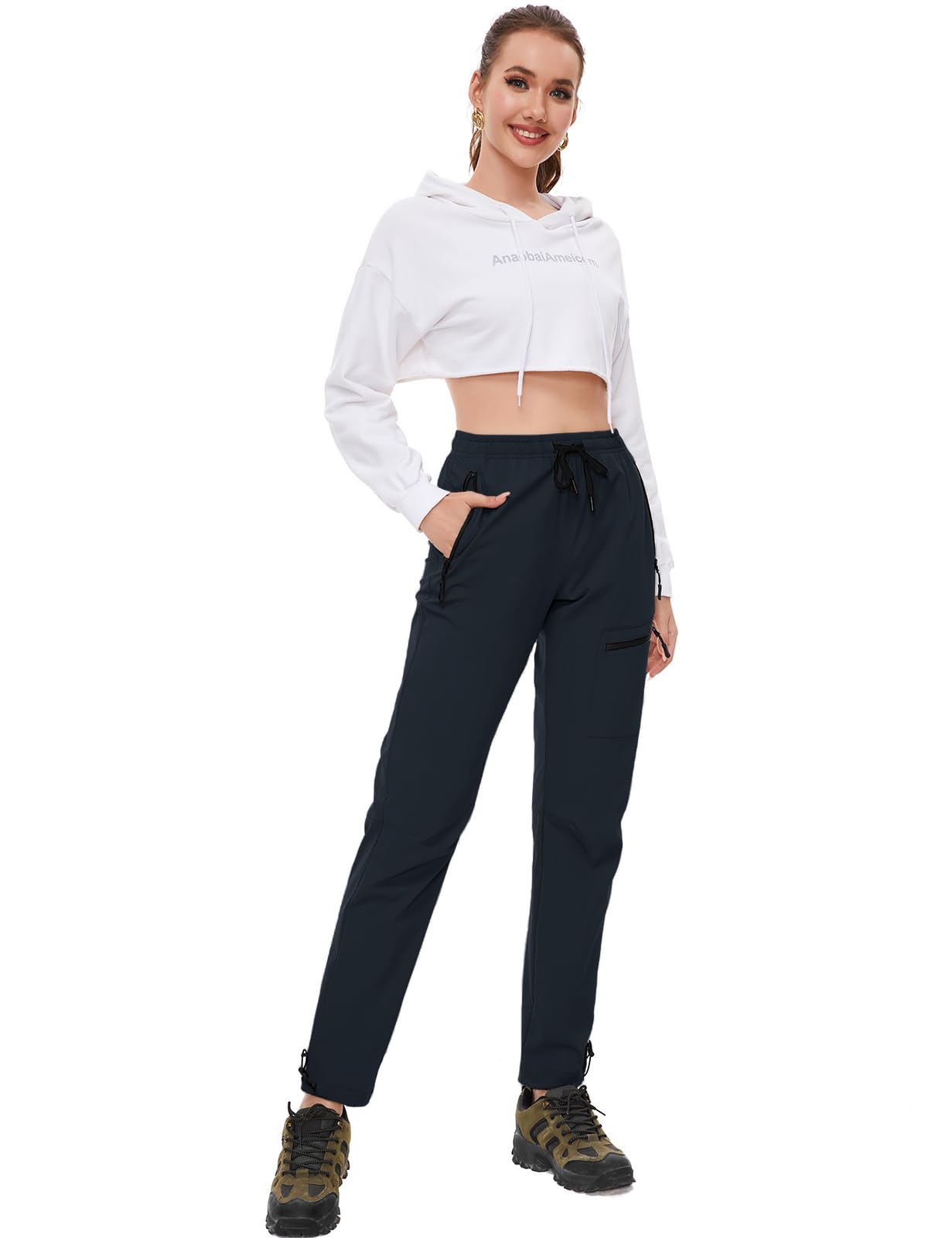 - Ingenious Details Design: Hiking pants women waterproof feature an elastic waistband and waist drawstring for a comfortable, adjustable fit that stays in place during activities. Two side secure-zip hand pockets, 1 hip pocket and 1 thigh zip pocket can be used to store mobile phones, keys, and other important valuables.