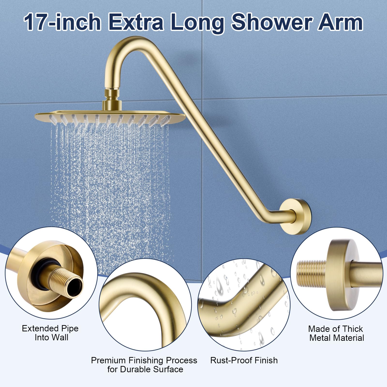 Shower Extension Arm with Flange Uvish 17" Shower Head Riser Pipe, Stainless Steel High Rise Long Neck Shower Head Arm Extender Arm for Rain Shower Head, Standard 1/2" Connection, Brushed Gold