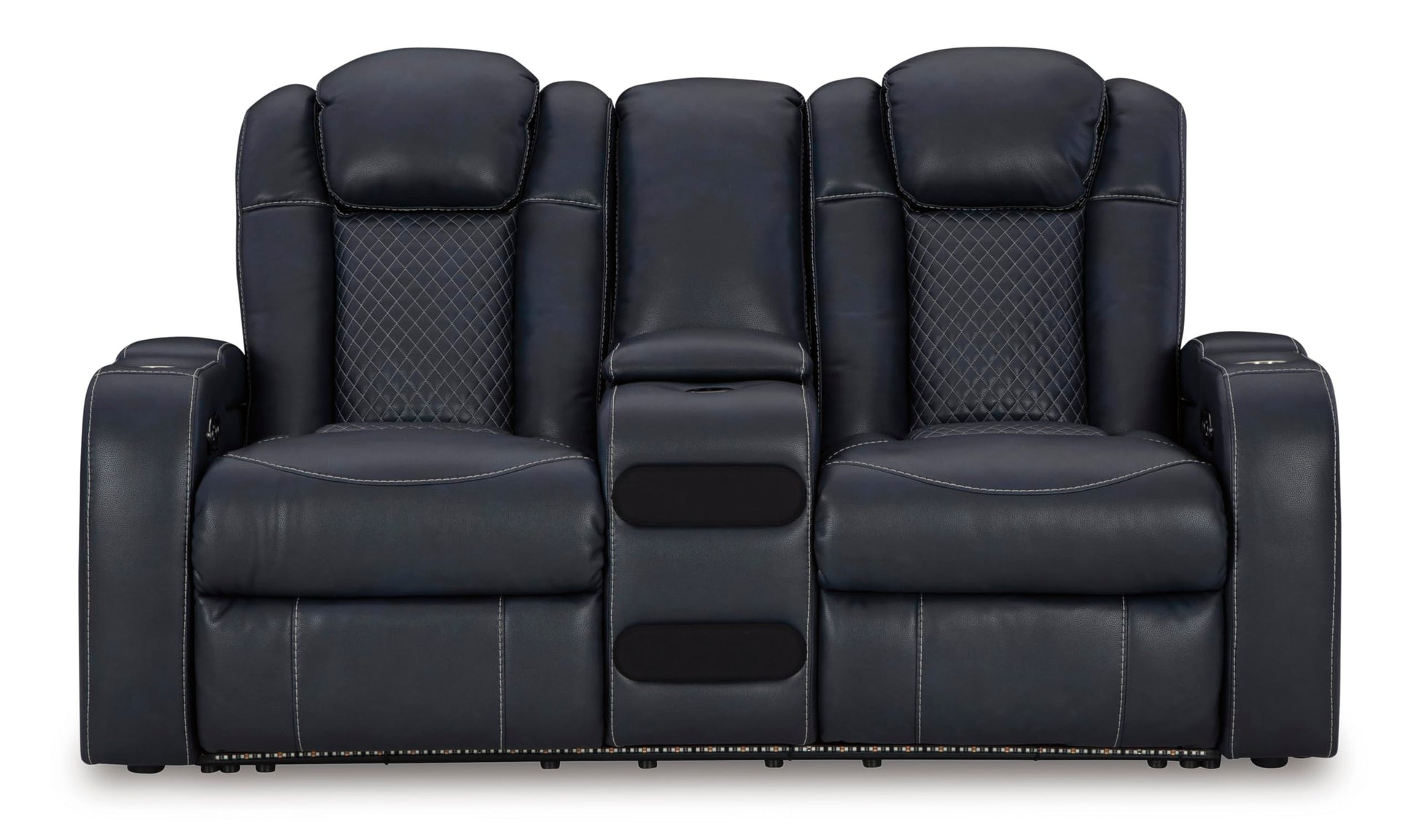 Signature Design by Ashley Fyne-Dyme Contemporary Power Reclining Loveseat with Console, USB Charging Ports and Adjustable Headrest, Blue
