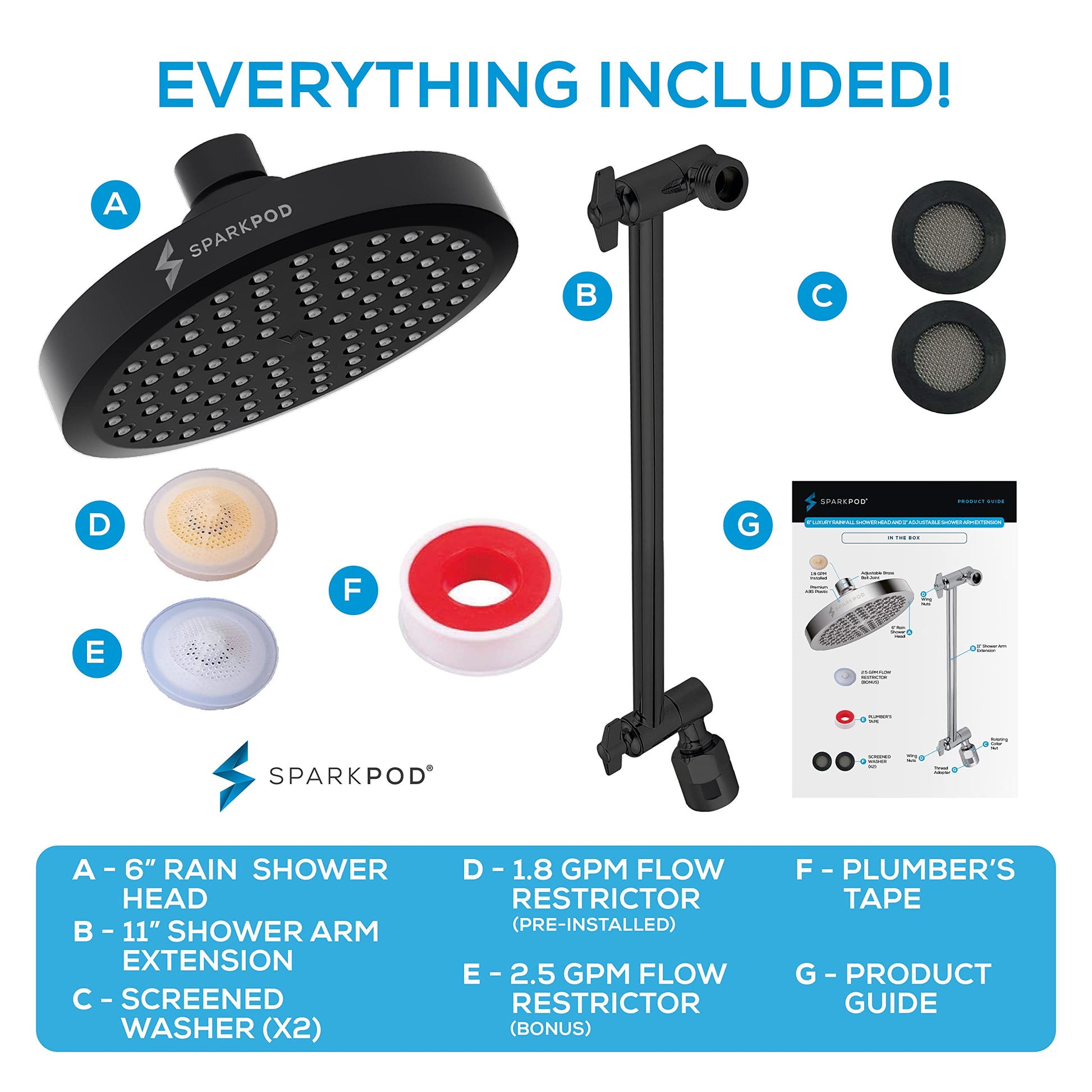 SparkPod Round Rain Shower Head with Extension Arm - Height Adjustable Shower Head with High Pressure Performance - Easy 1-Minute Installation (11" Arm Extension, Midnight Black Matte)