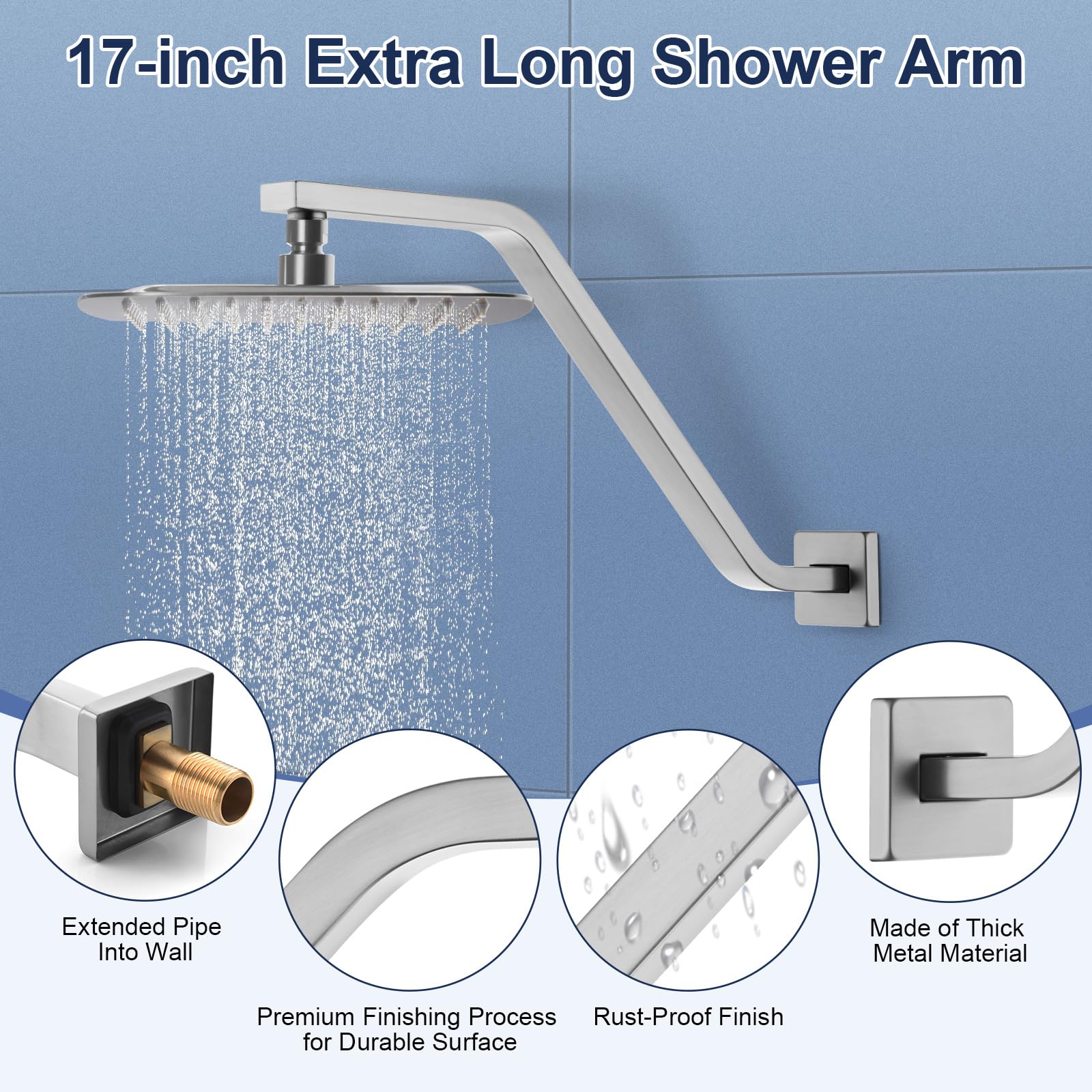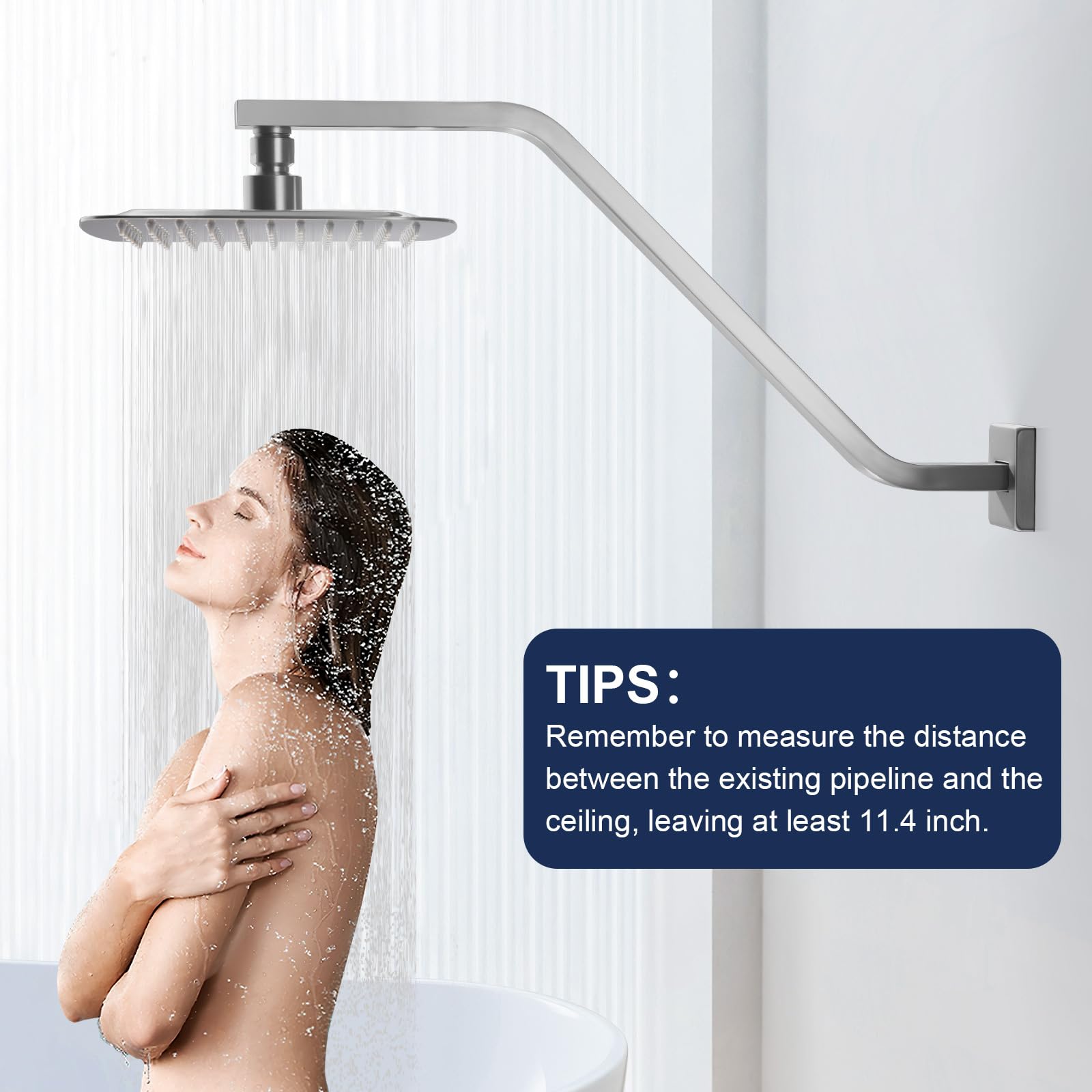 - 【EXTRA LONG SHOWER ARM EXTENSION】Please ensure your shower area has at least 8.5 inches clearance between the plumbing and ceiling to accommodate this square shower head extension arm. Perfectly pairs with rainfall showerheads over 8 inches. Please note, this is a non-adjustable arm, crafted for stability and elegance