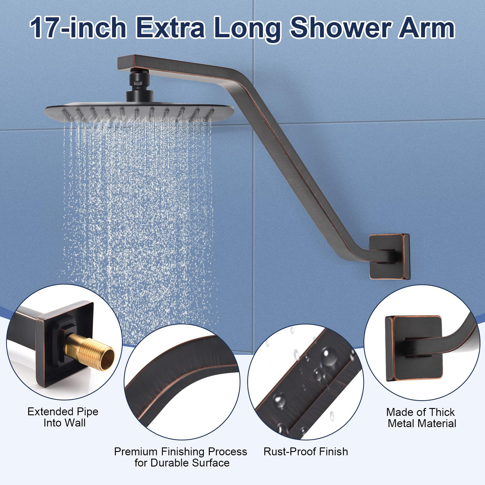 - 【EXTRA LONG SHOWER ARM EXTENSION】Please ensure your shower area has at least 8.5 inches clearance between the plumbing and ceiling to accommodate this square shower head extension arm. Perfectly pairs with rainfall showerheads over 8 inches. Please note, this is a non-adjustable arm, crafted for stability and elegance