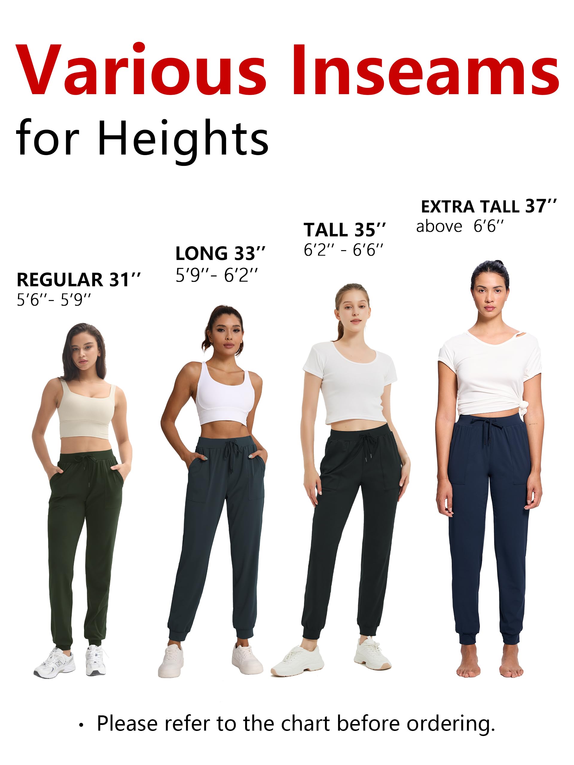 - 4 Inseam Lengths: The womens joggers pants feature with 4 different inseam options for tall women: Regular - 31" inseam fits women 5'6"-5'9"; Long - 33" inseam fits 5'9"-6'2"; Tall: 35" inseam fits 6'2"-6'6"; Extra Tall: 37" inseam fits women above 6'6"