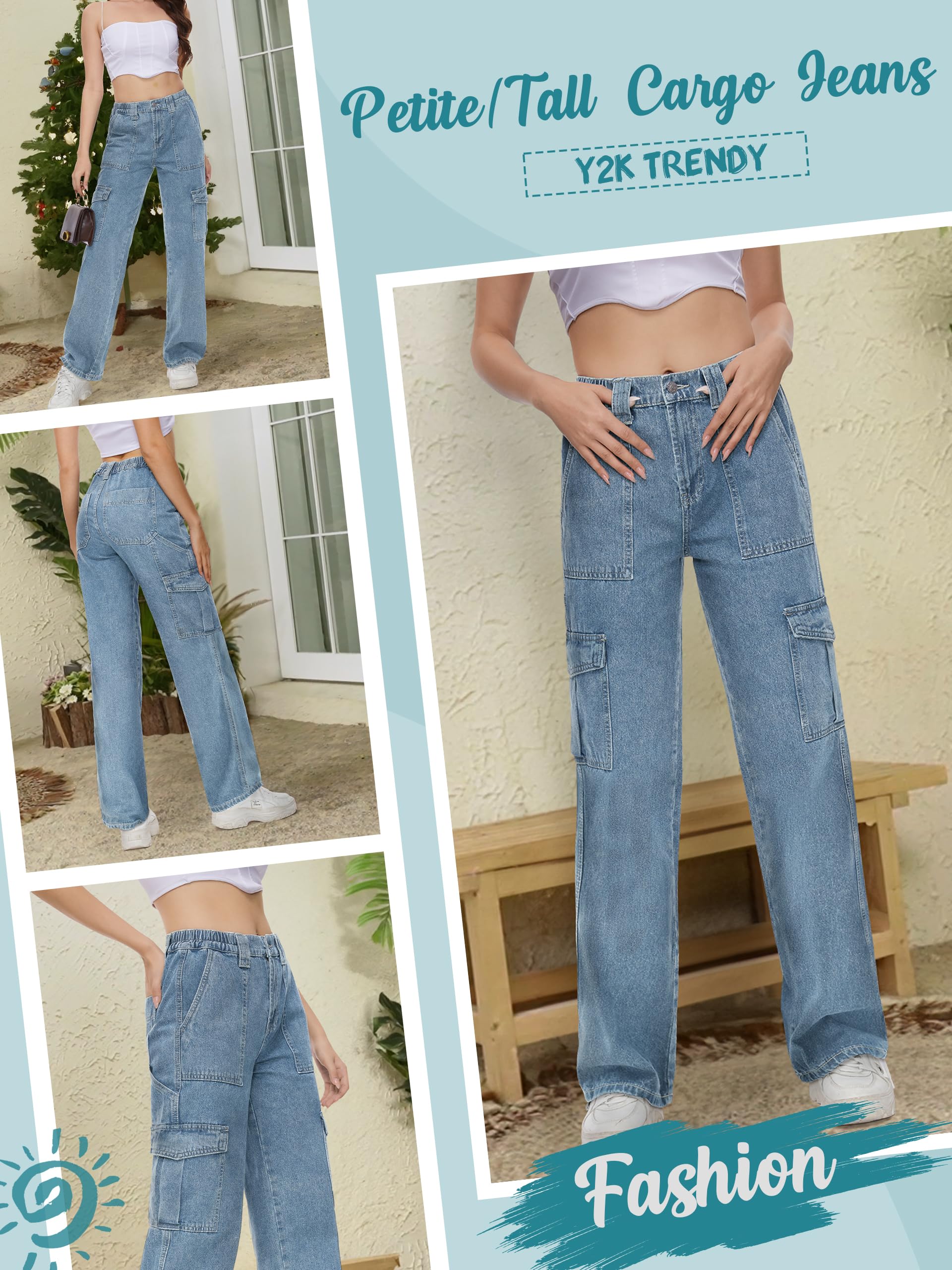Tapata Women's 26"/28"/30"/32"/34" Cargo Jeans Straight Leg Short Petite Regular Tall Denim Y2K Pants Light Blue, XL