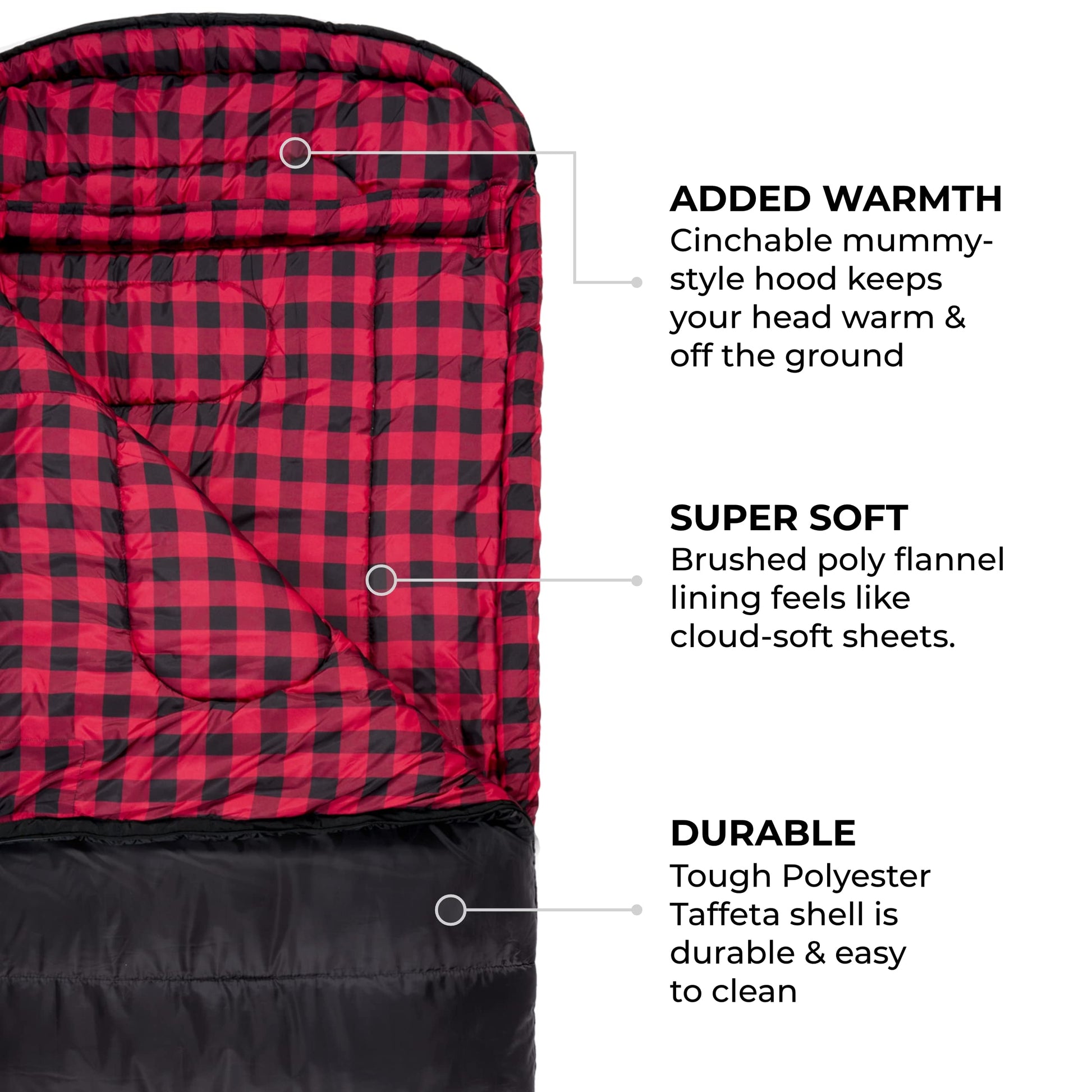 - SLEEP COMFORTABLY: You'll forget you're camping with these comfortable sleeping bags! With a soft poly-flannel lining and plenty of room to spread out. The half-circle mummy-style hood keeps you warm and your pillow clean, unzips on each side
