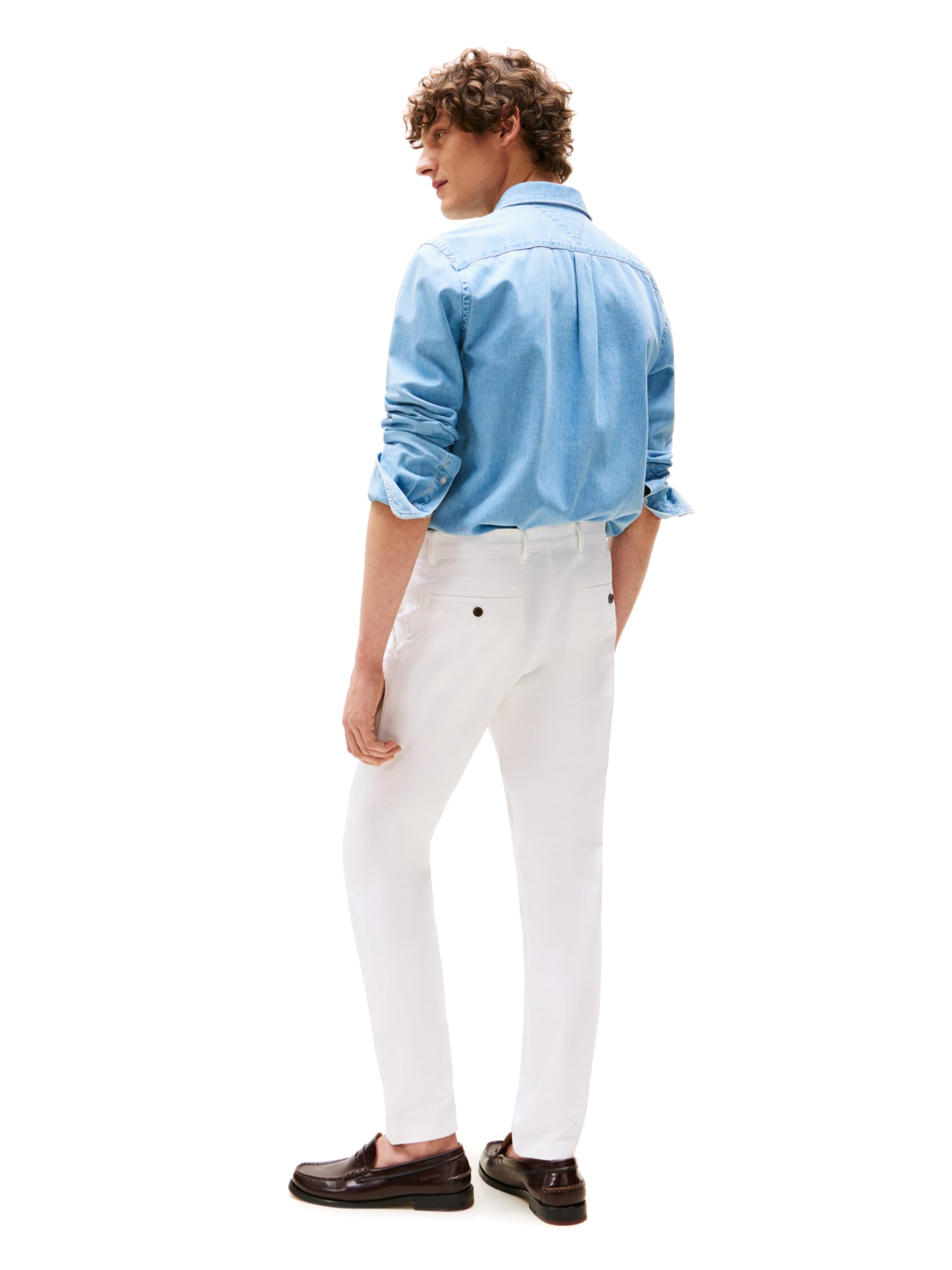 - SLIM FIT: With a streamlined, modern look, these Tommy Hilfiger chinos for men are cut slim through the seat and thigh and taper toward the ankle. Designed to sit just below the waist, they feature a mid-rise.