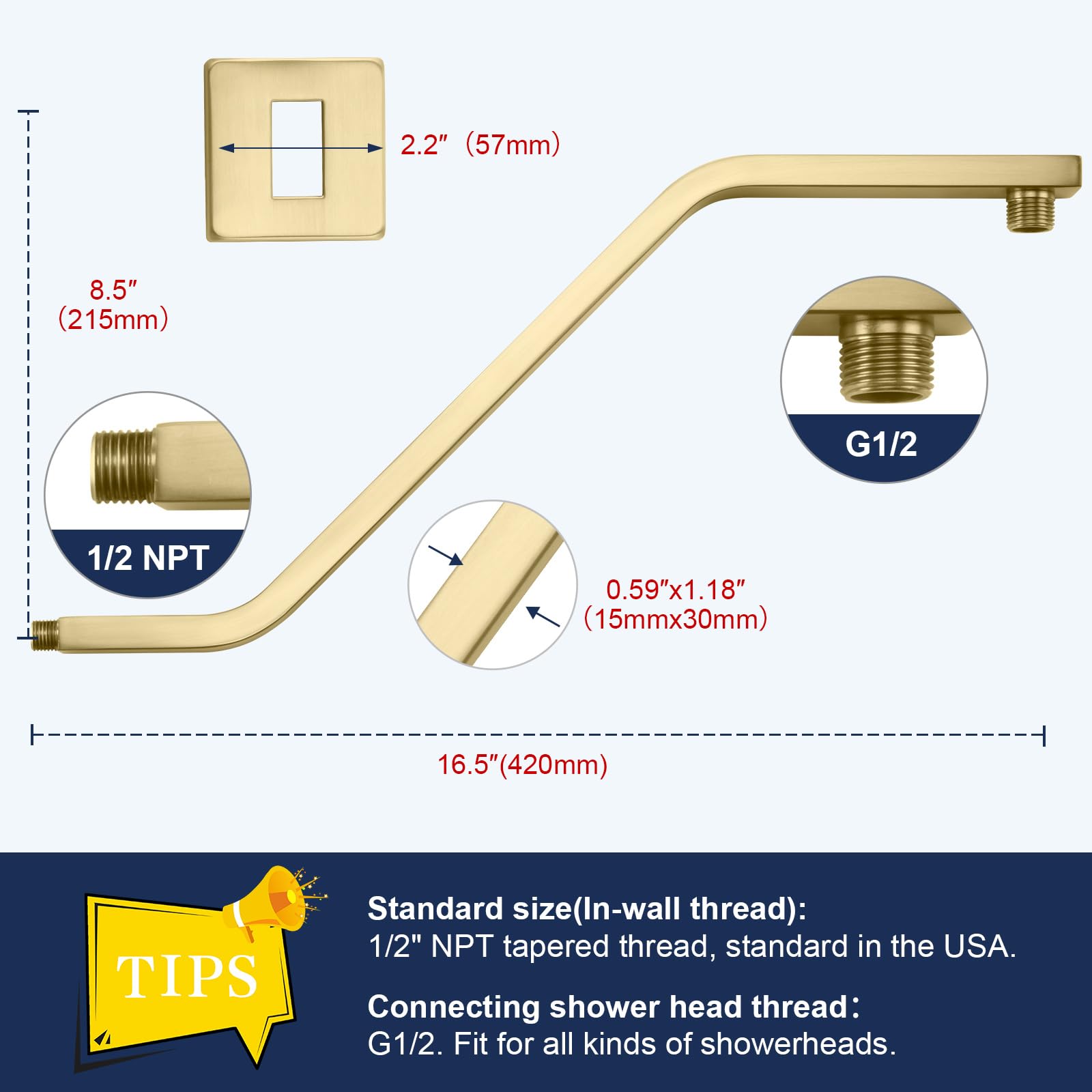 - 【STANDARD CONNECTION】Equipped with both in-wall and outlet threads, the rain shower head riser extension arm features U.S. Standard 1/2 NPT inlet threads, fitting most standard U.S. plumbing connections. The enhanced 0.86" thread length provides a secure seal, which is longer than the normal 0.66". (Pro tip: Screw the 1/2 NPT connector onto the shower arm first before mounting it to the wall. ) The G1/2 outlet thread is universally compatible with all market-available sprinkler interfaces